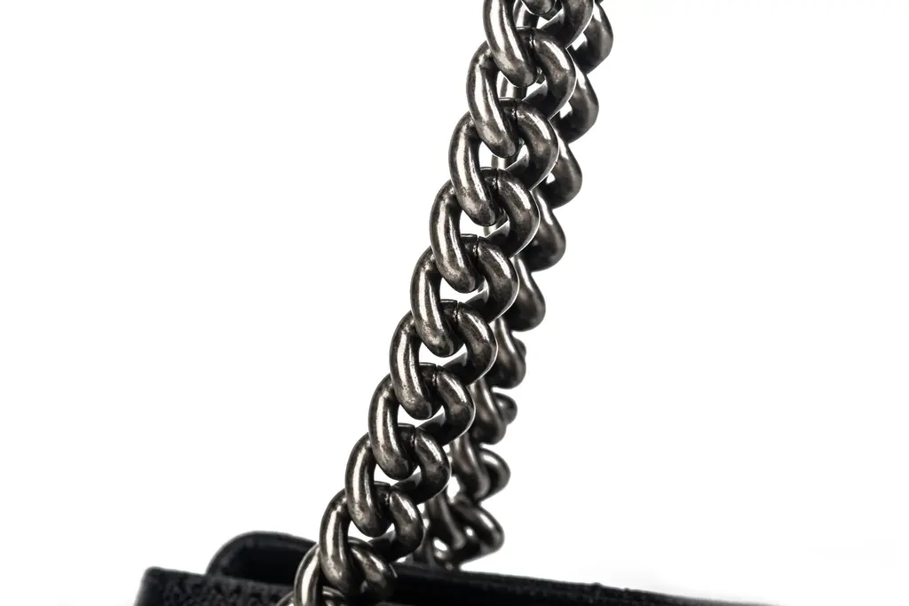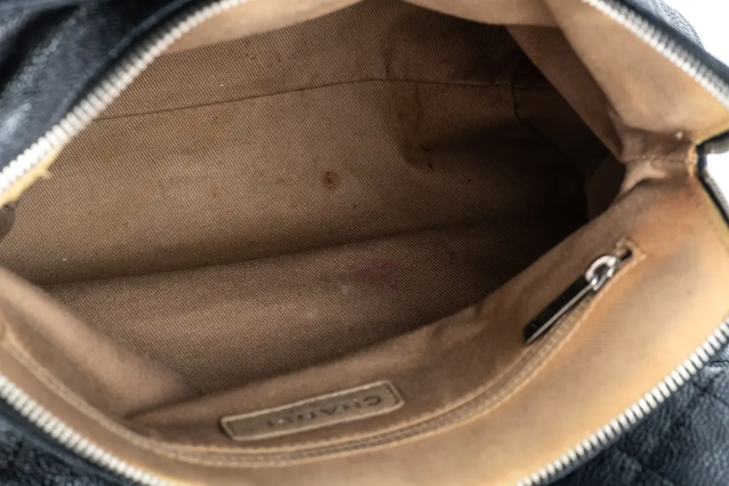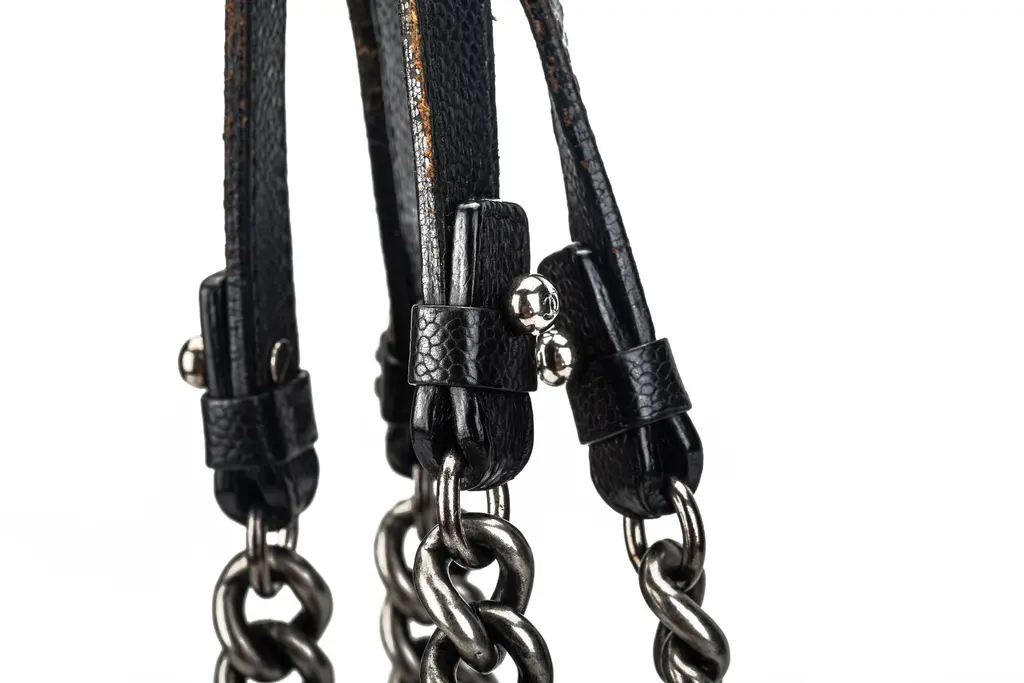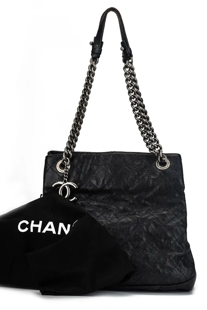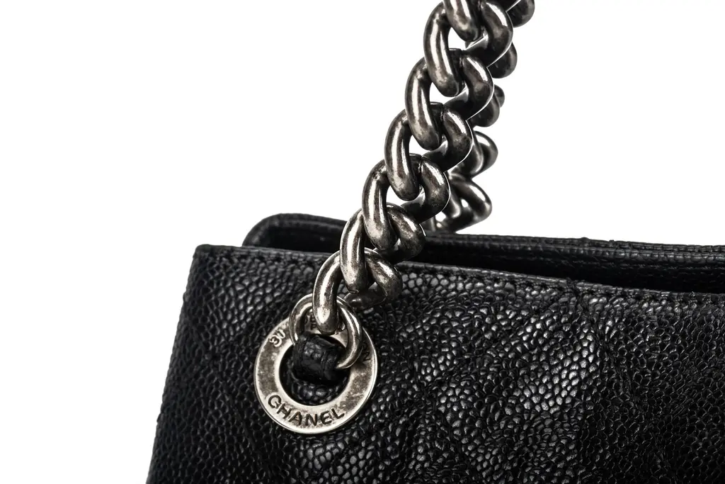 Chanel black caviar lambskin leather with silver tone hardware. Shoulder drop 10". Generic