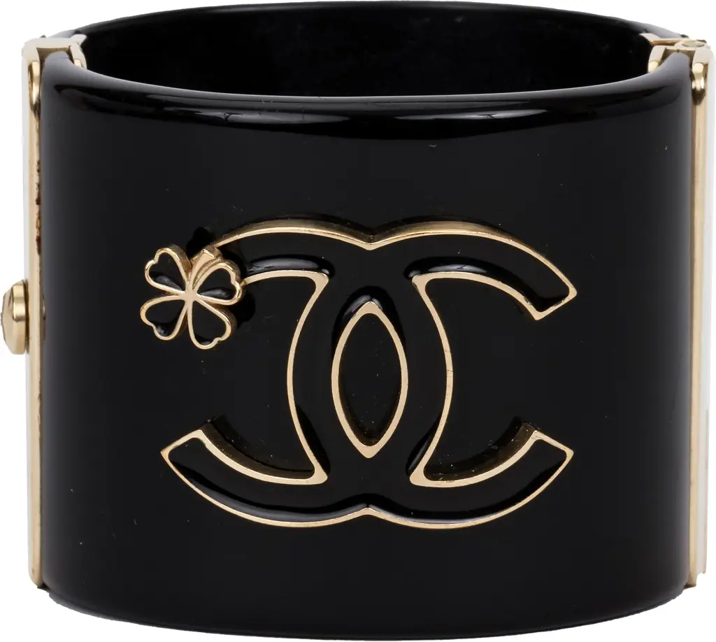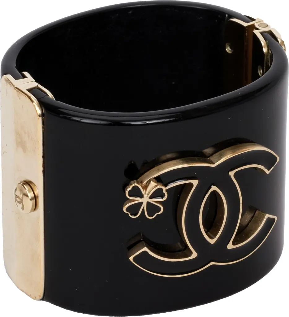 Important Chanel black lucite hinged oval cuff, CC logo with clover. Comes with original box.