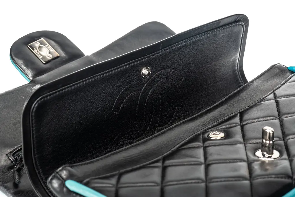 Highly collectible butte lambskin double flap with turquoise leather trim. Ruthenium hardwware. Should drop 9.5"/17". Collection 11. Comes with hologram and generic dust cover.