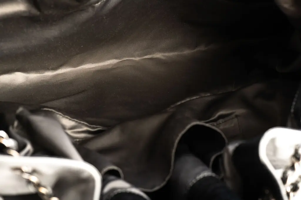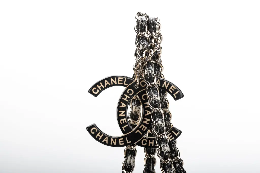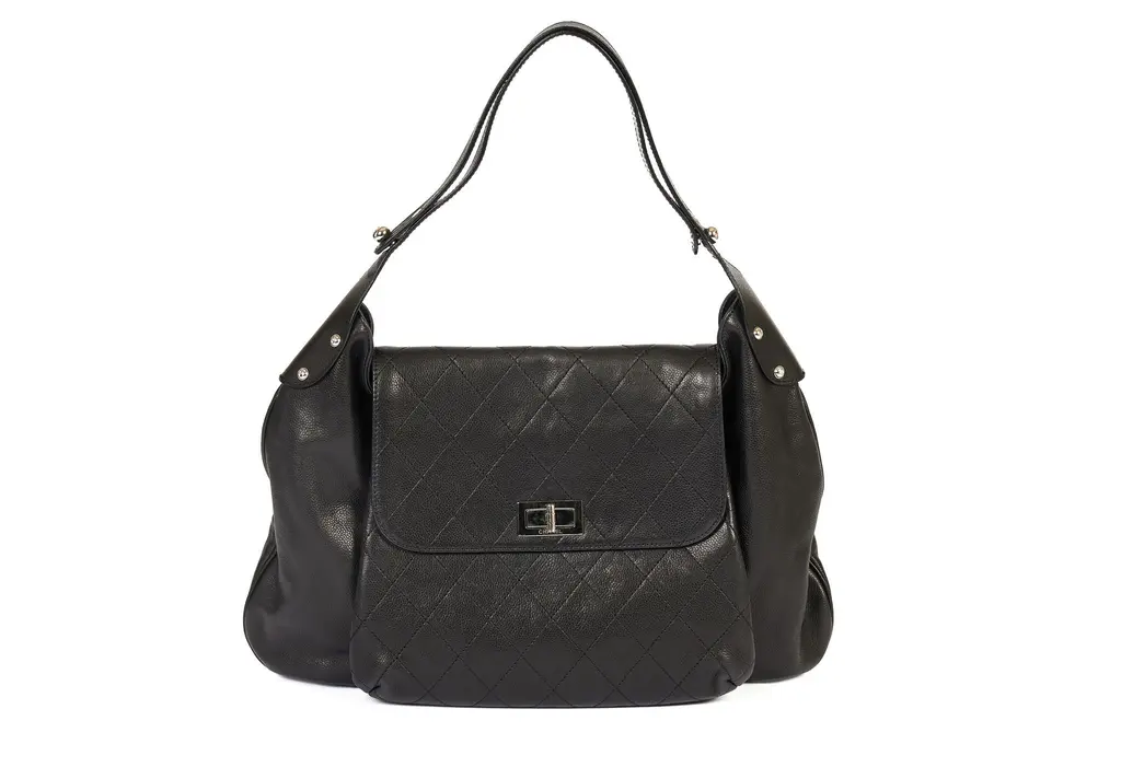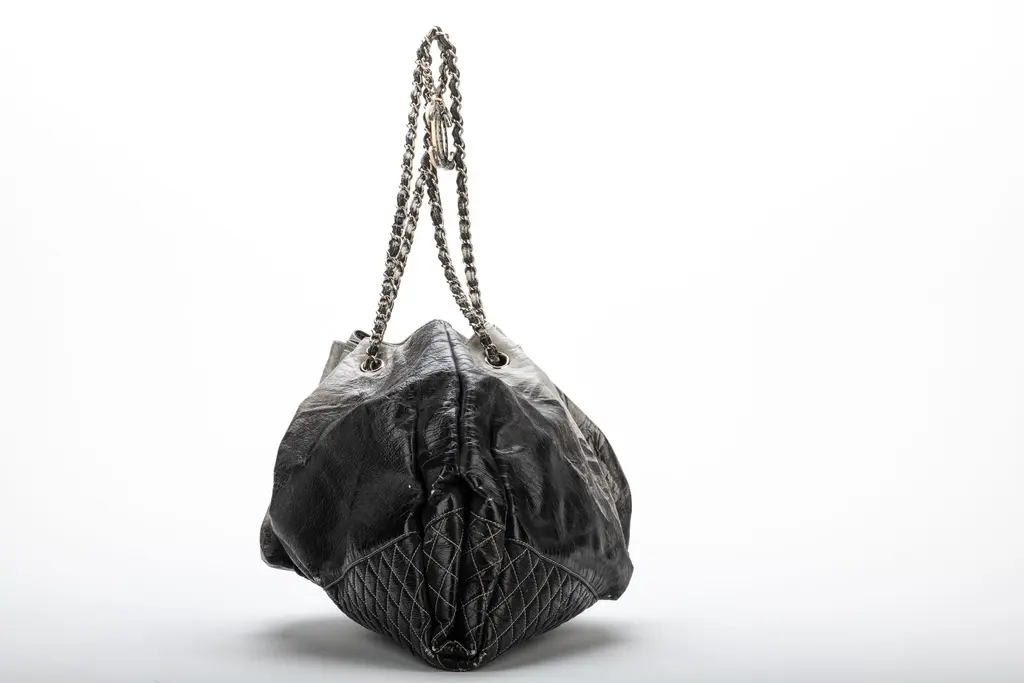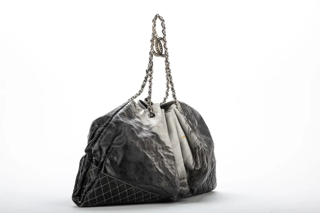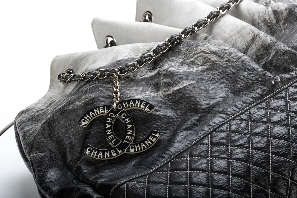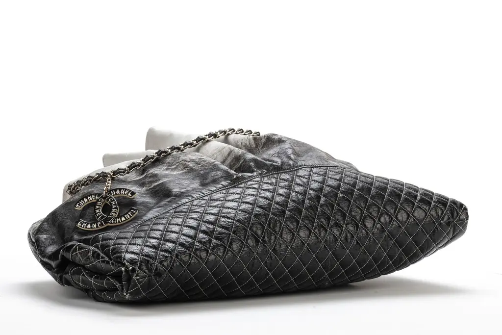 Chanel large shoulder bag in patent leather and silver tone hardware, Degrade' color form grey to black. Shoulder drop 12". Minor scuffs pictured in photos. Comes with hologram, booklet , ID card, no dust cover.
