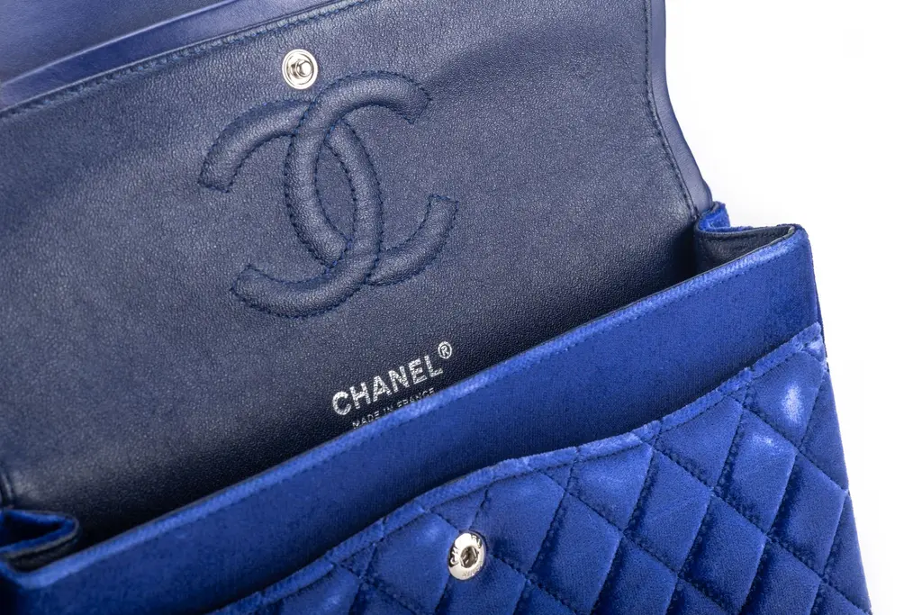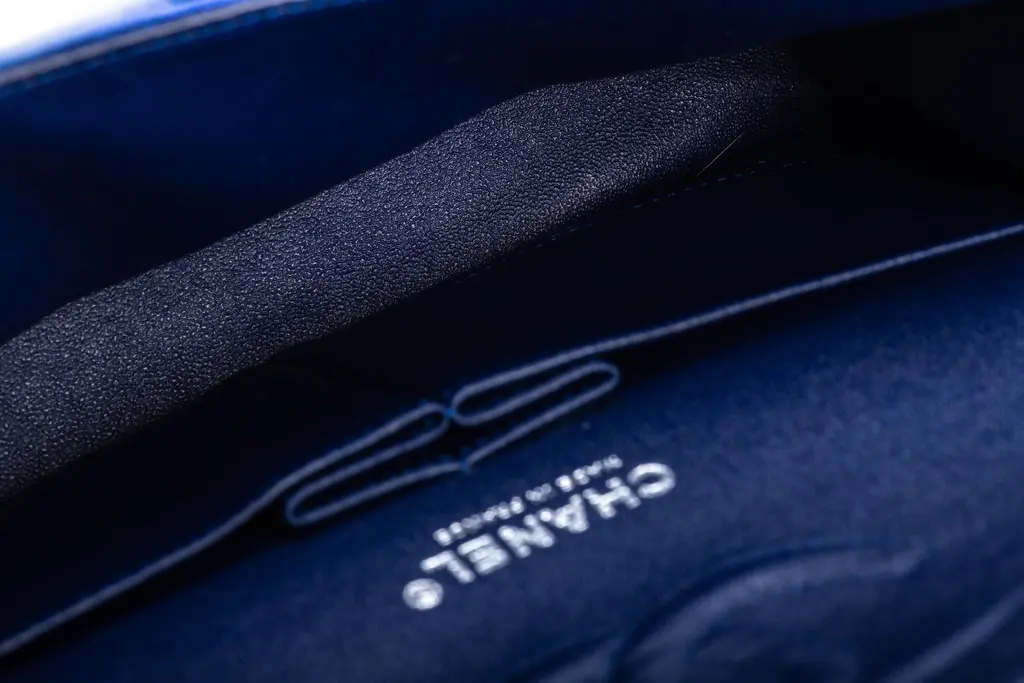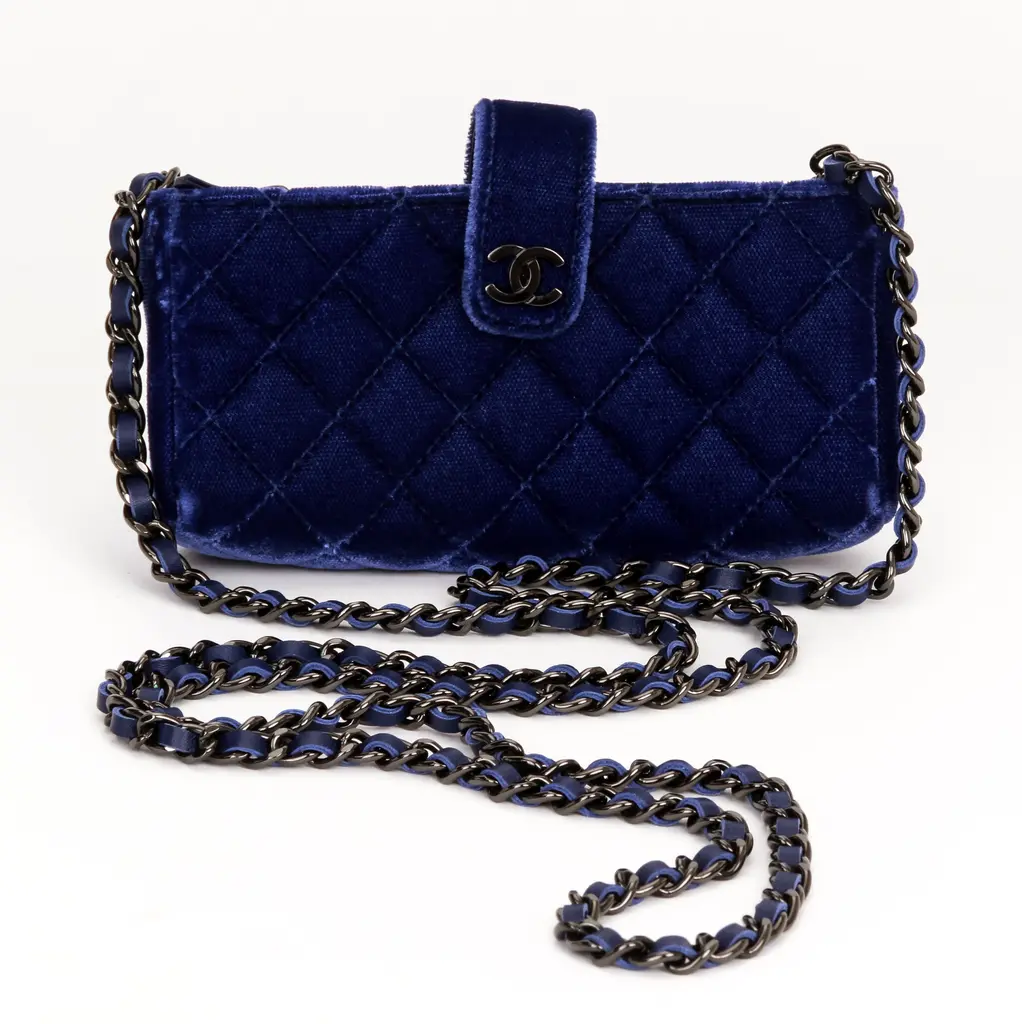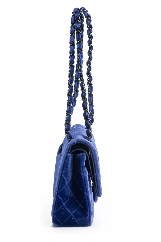Chanel excellent condition blue velvet double flap, blue leather lining and black hardware. Shoulder drop 9��/19��. Comes with hologram, ID card and original dust cover. Collection 20.