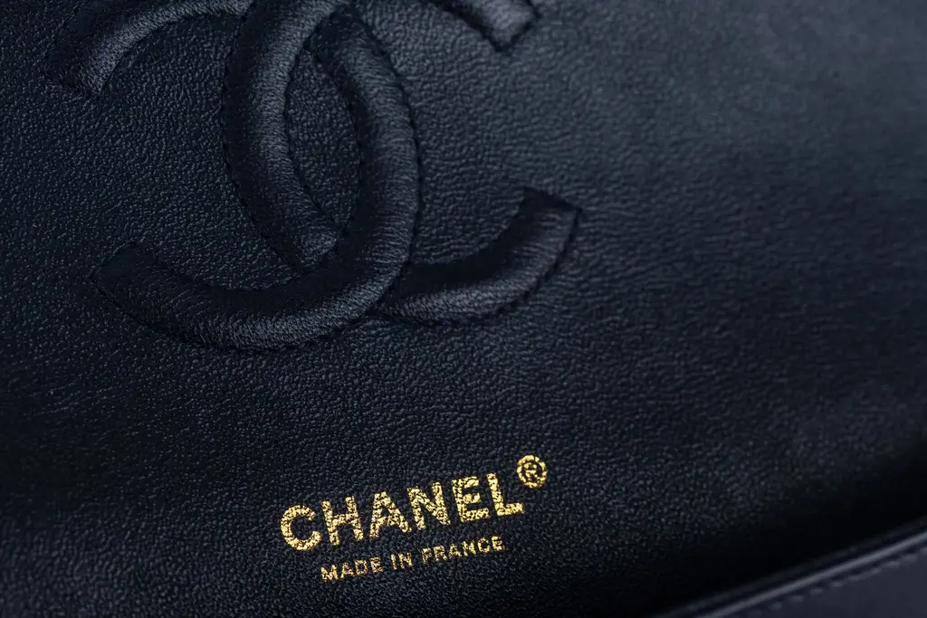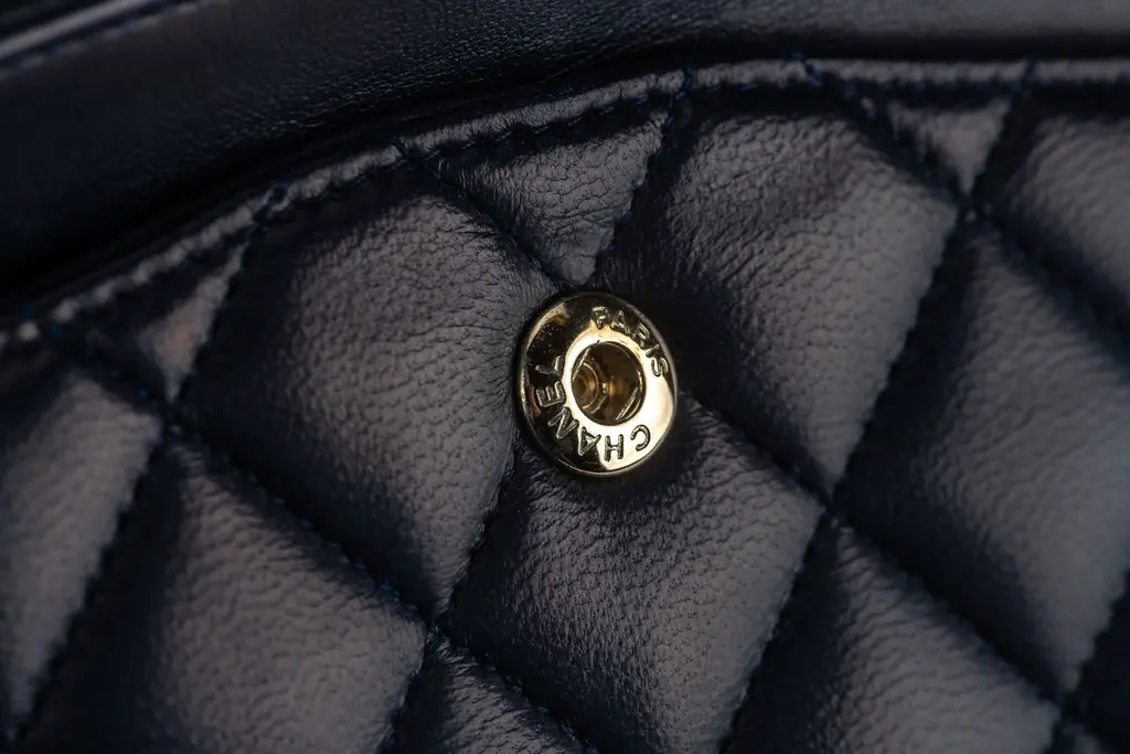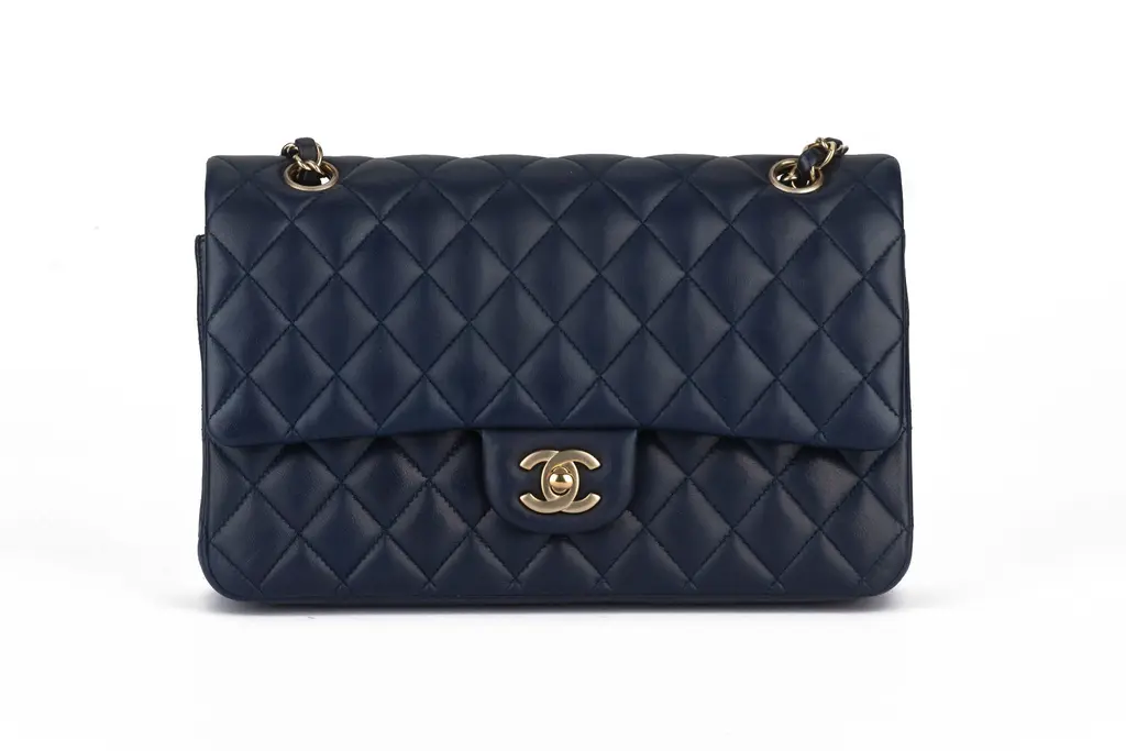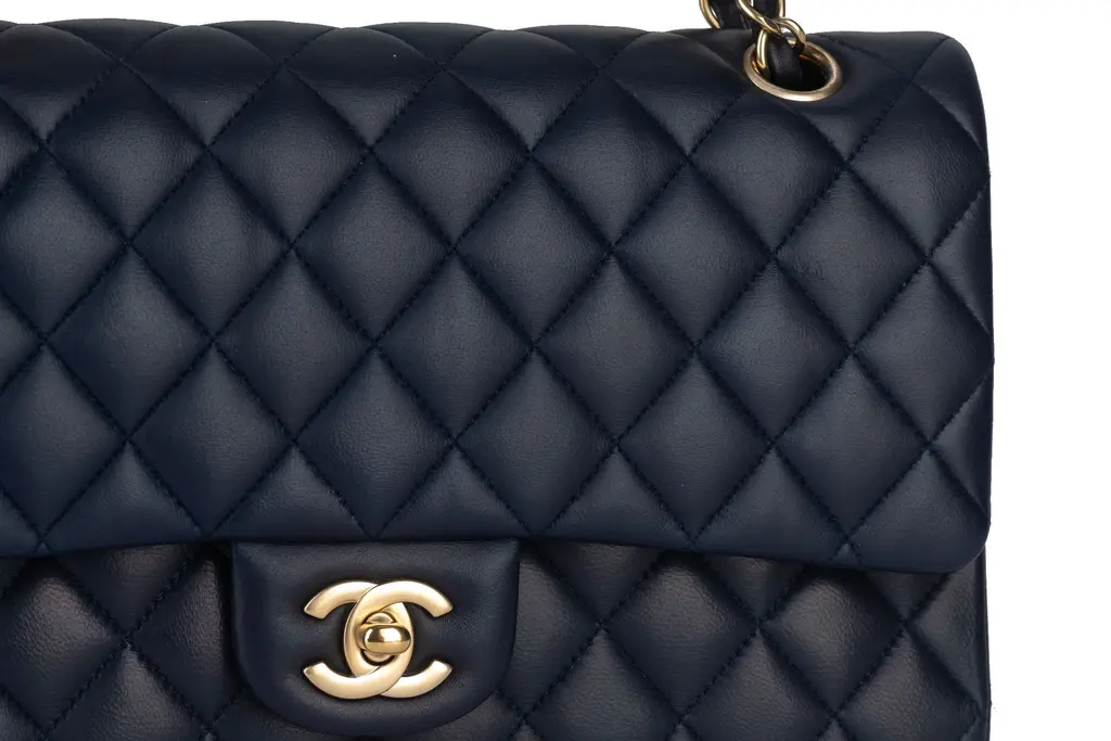 This Chanel navy blue Double Flap Bag is made of beautiful dark blue diamond quilting lambskin leather with gold tone hardware/chain link shoulder strap, double flap closure, CC turn lock, interior slip and patch pockets, and one half moon rear pocket. From collection 20. Comes with hologram, id card, blacked out copy of receipt and original dust cover.