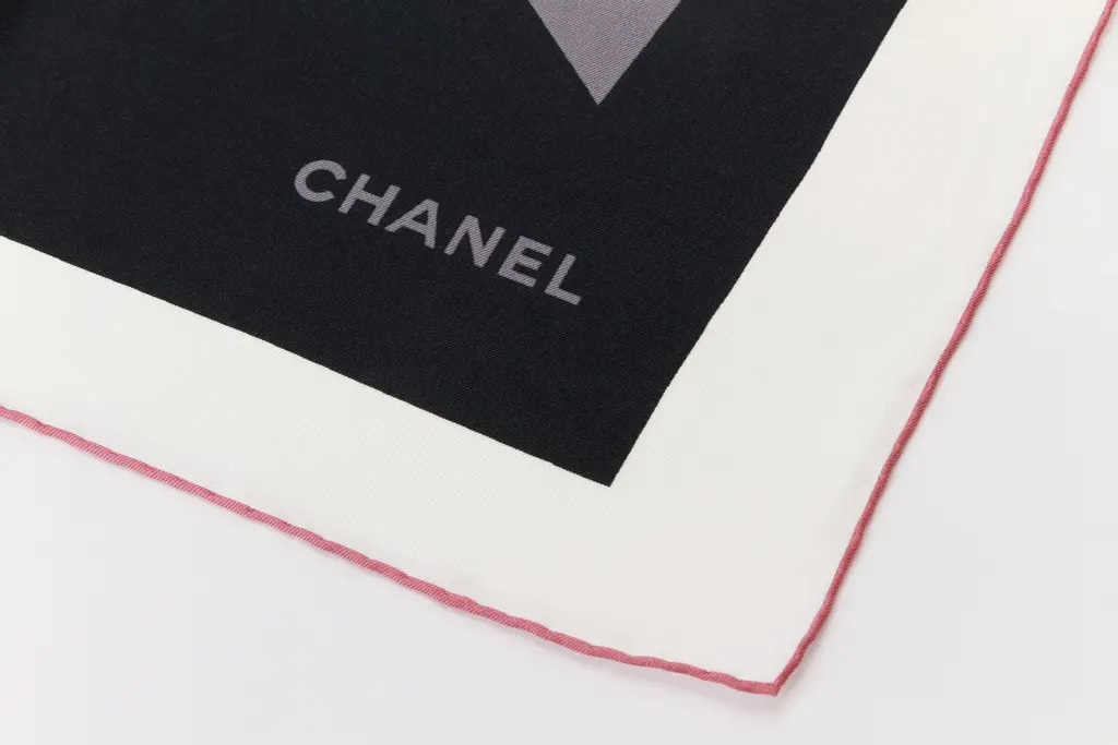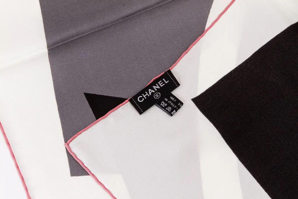 Chanel new black, gray and pink logo geometric scarf, 100% silk, 35" x 35"