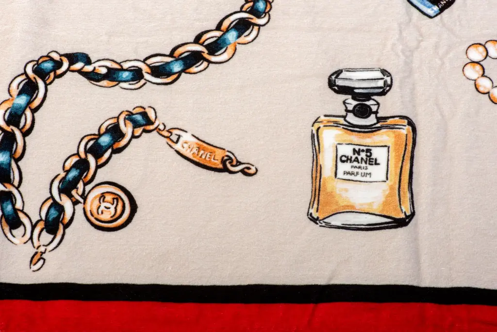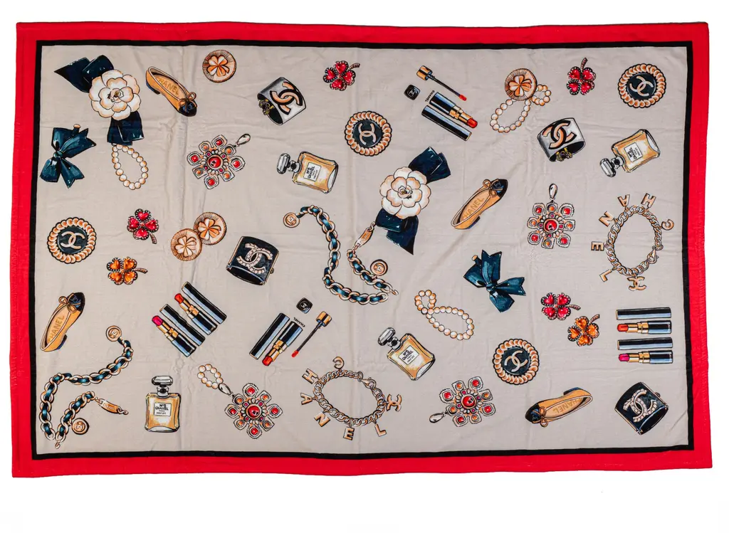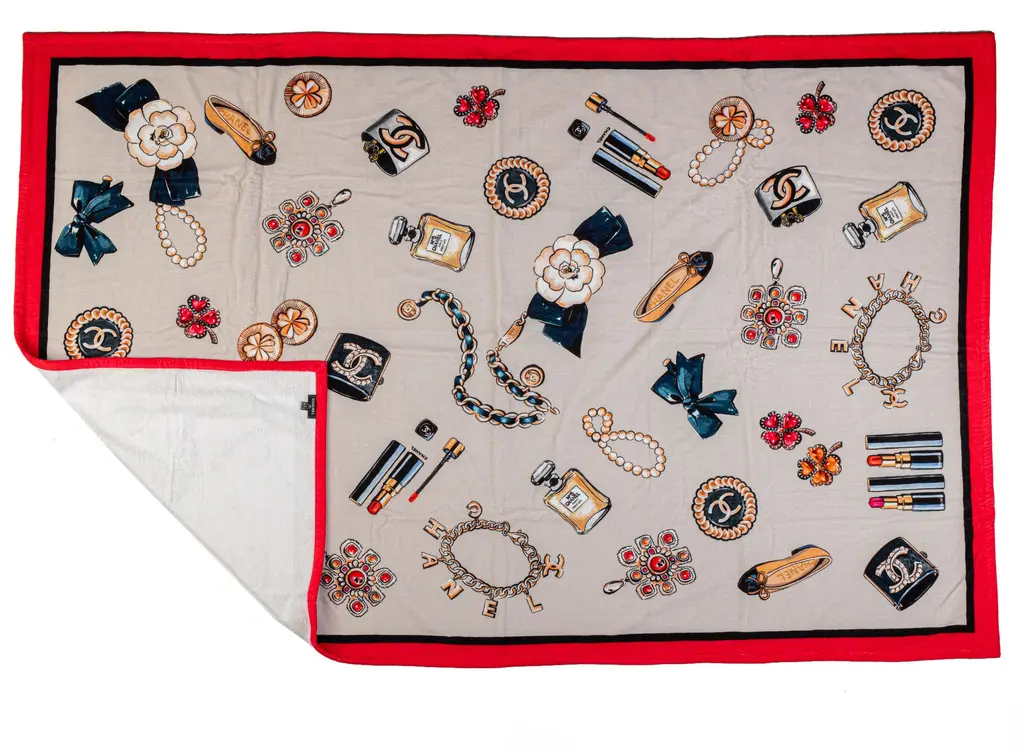 Chanel brand new beach set, tote and matching beach towel. Terry cloth red bag lined in cotton print matching the terry cloth towel. Detachable pouch can be worn separately. Towel 100% cotton, 70" x 48". Sometimes imperfections in the print might be visible.