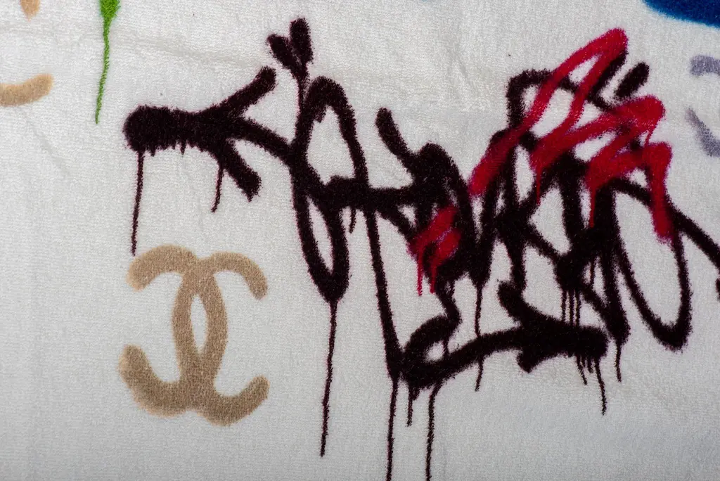 Chanel brand new oversize graffiti beach set. White with multicolor pattern, lined in white cotton. Terry cloth towel 70" x 48". Sometimes imperfections in the print might be visible.