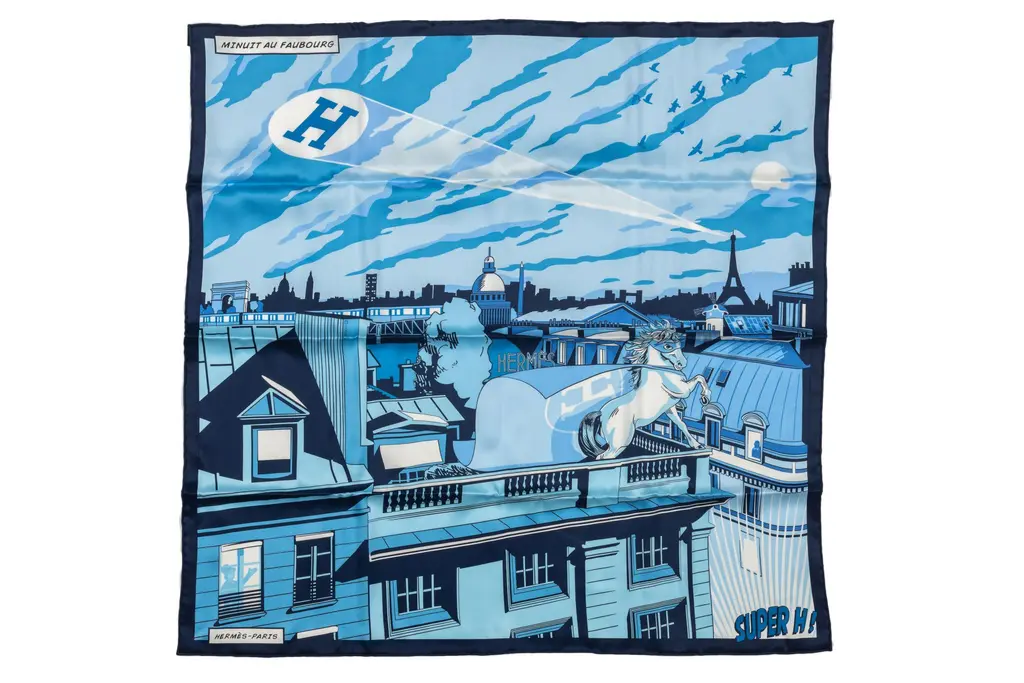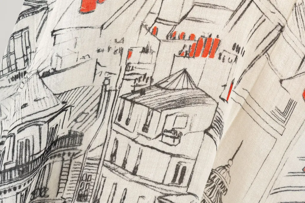 Chanel new white cashmere shawl. Red and black roofs of Paris design. Care tag attached.