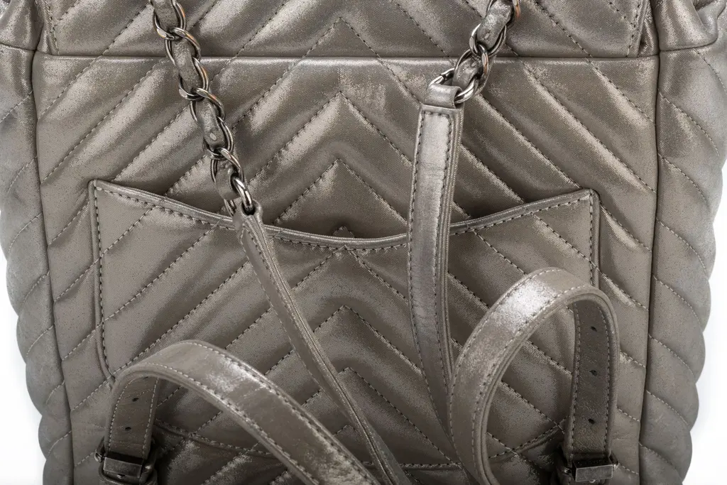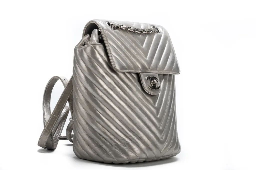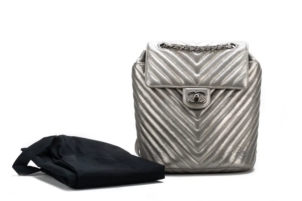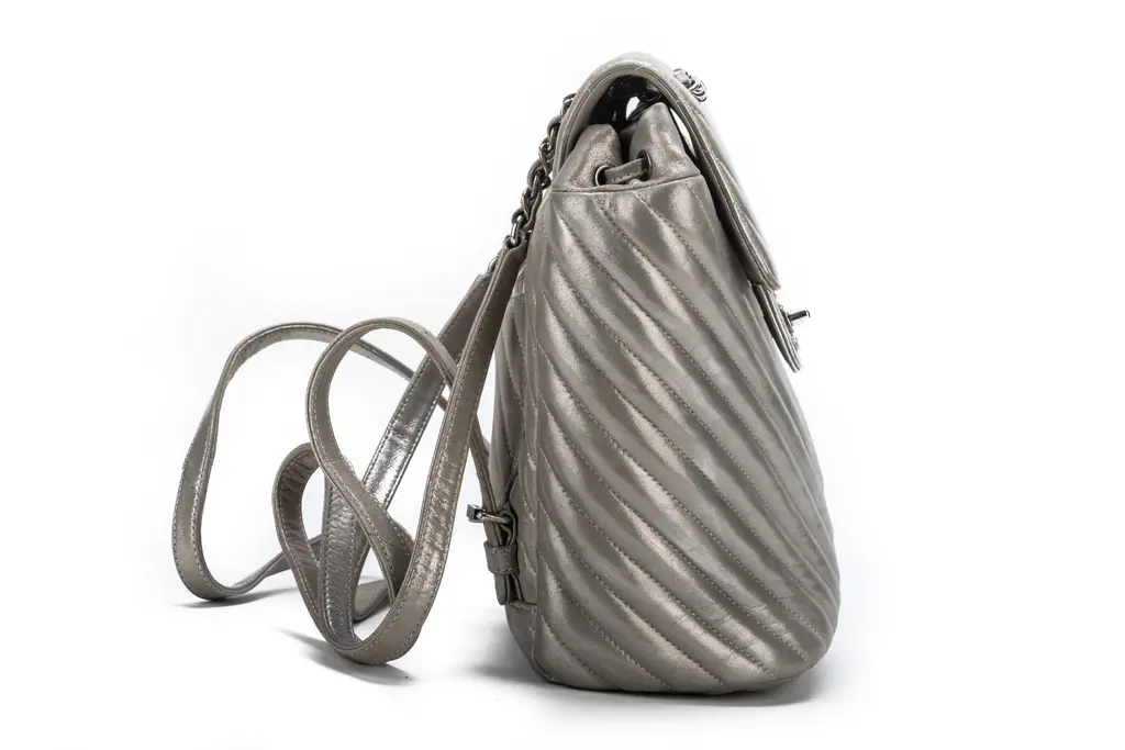 Chanel mint condition silver lambskin chevron backpack. Handle drop 4��, adjustable straps. Comes with hologram, card and original dust cover. Collection 22.