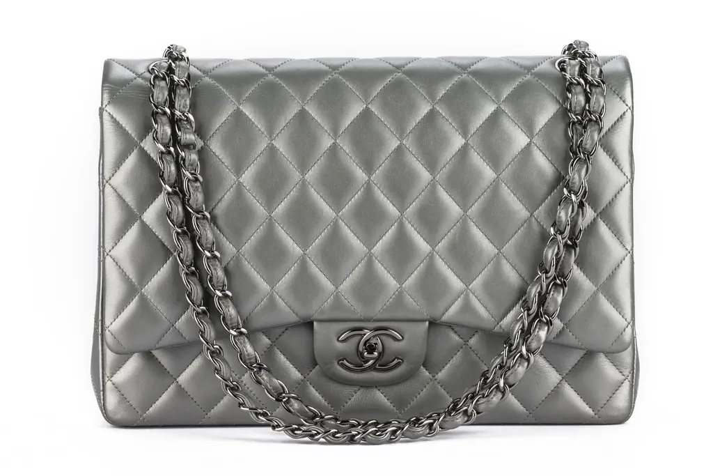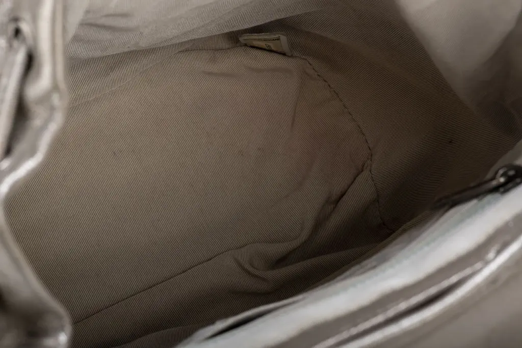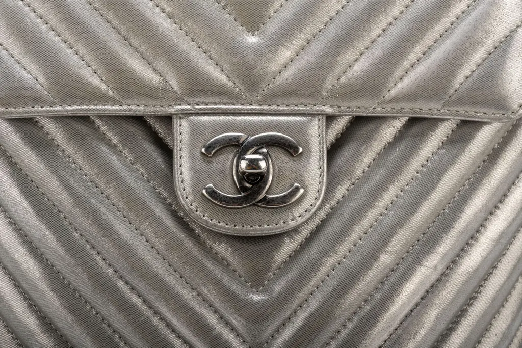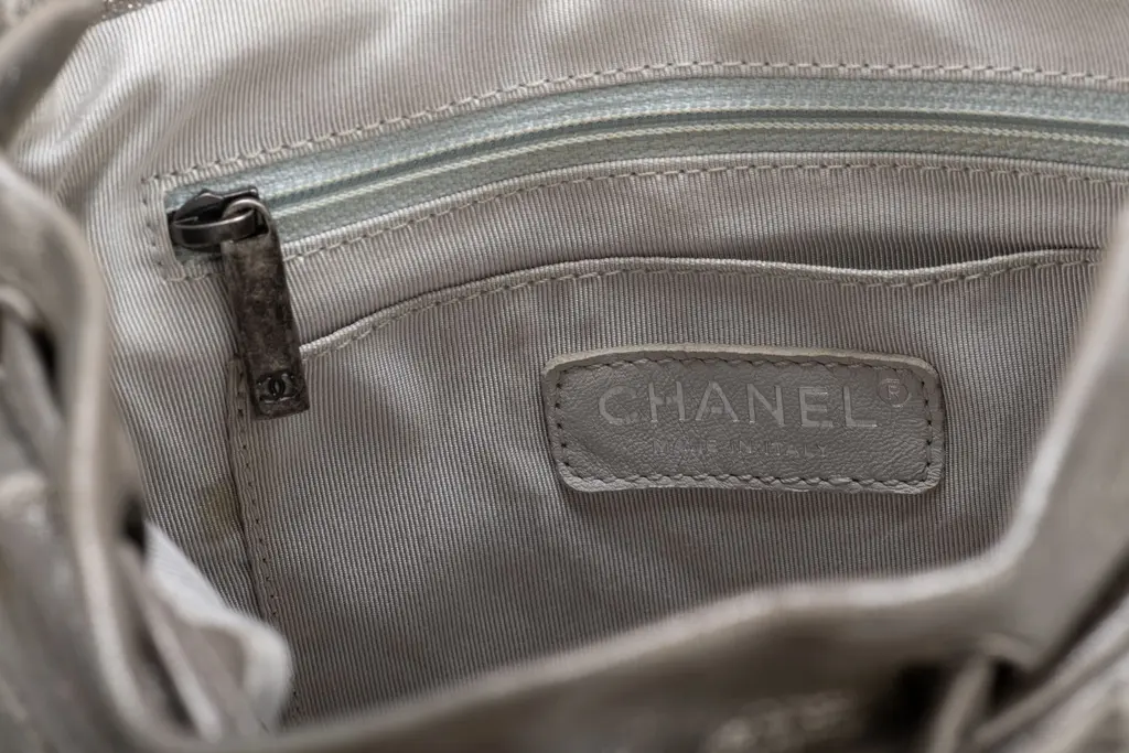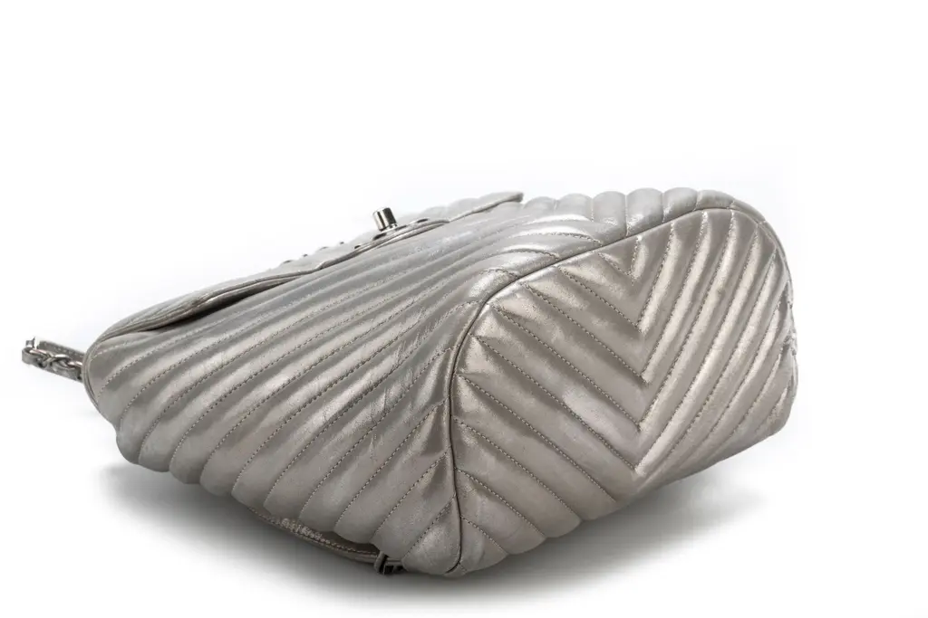 Chanel mint condition silver lambskin chevron backpack. Handle drop 4��, adjustable straps. Comes with hologram, card and original dust cover. Collection 22.