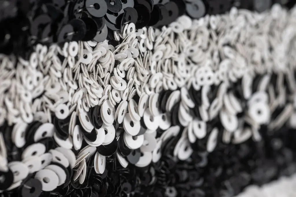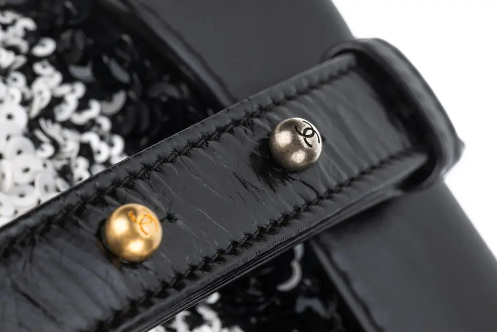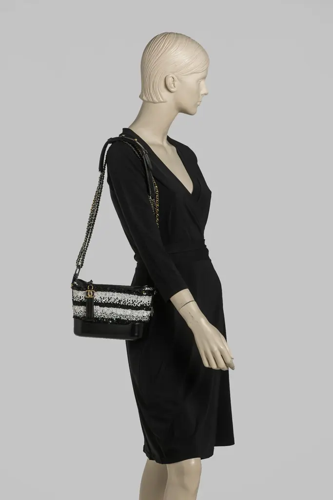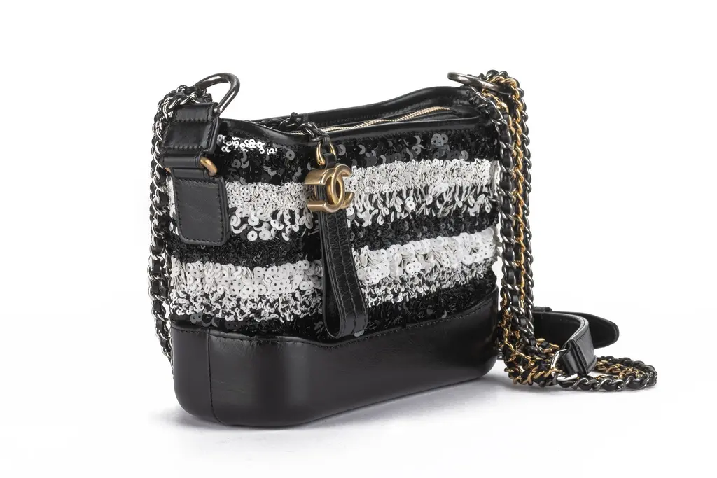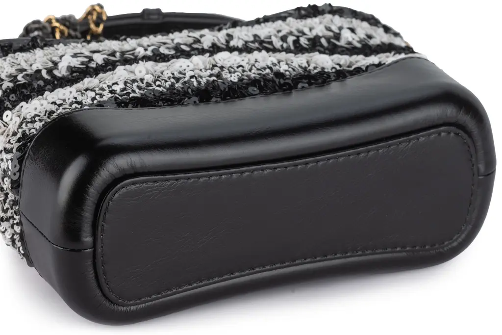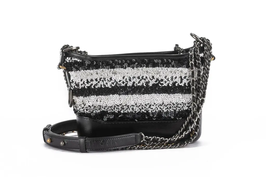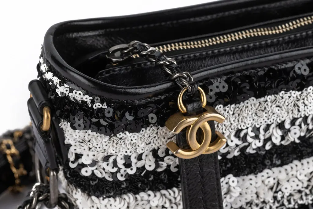 The Chanel Black and White Sequin Gabrielle Hobo from the 2019 Collection by Karl Lagerfeld features an inter-locking CC Logo on a zipper pull, chain-link adjustable shoulder strap, leather trim embellishment, canvas lining, and three interior pockets. The bottom is rigid, in leather. Comes with an authenticity card and original dust cover. First two numbers 26.
