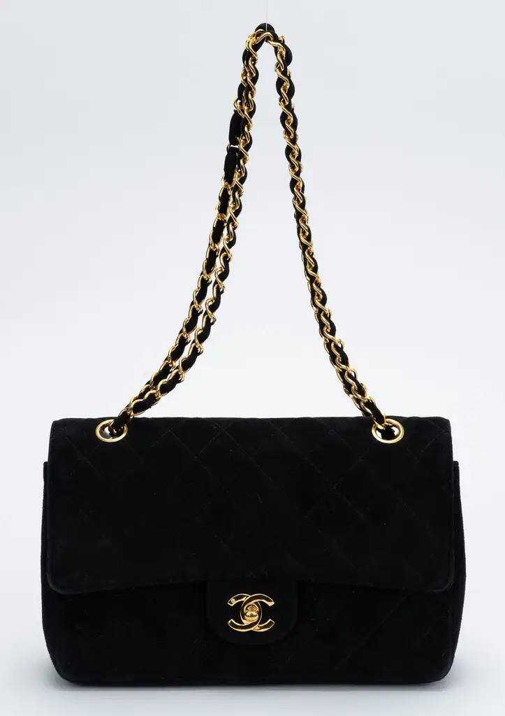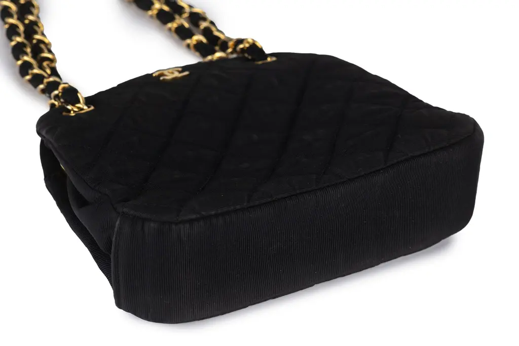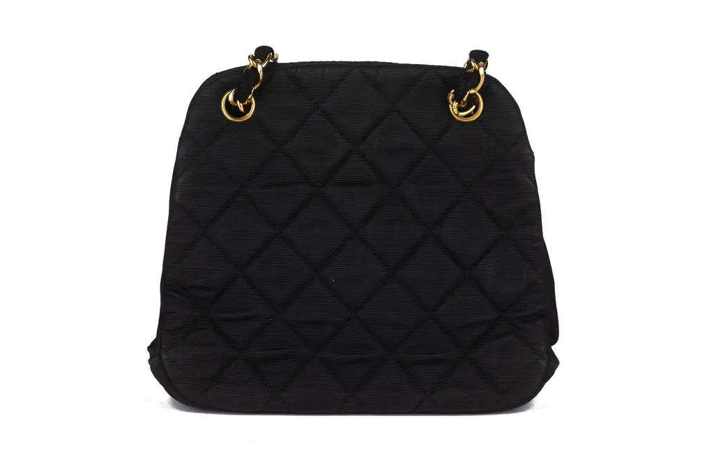 This Chanel Matelasse Chain Shoulder Bag in black toile has gold hardware and a chain link shoulder strap and a classic CC logo on the front. The top is fastened by a clasp that opens up to a roomy interior with two slit pockets. Comes with hologram and original dust cover. Late 80s collection.
