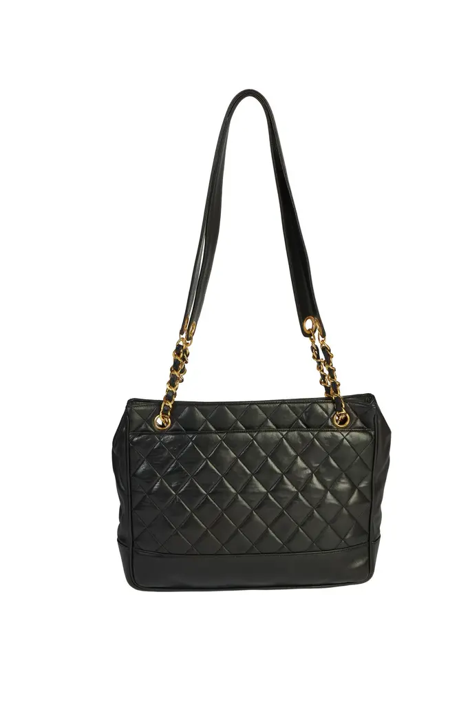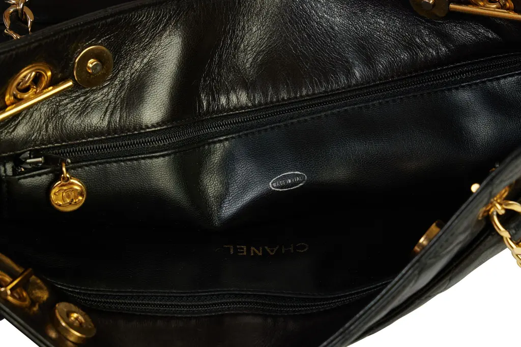 Chanel black vintage shoulder tote with gold tone hardware. Super comfortable leather shoulder straps. Collection 1991/1994. Shoulder drop 14.5". Comes with hologram and original dust cover.