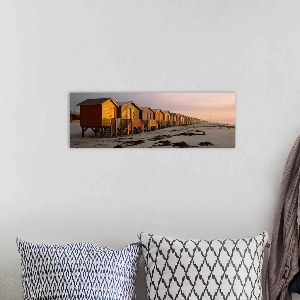 A panoramic photograph of a row of buildings built on the sandy shoreline glowing in the light of sunset.