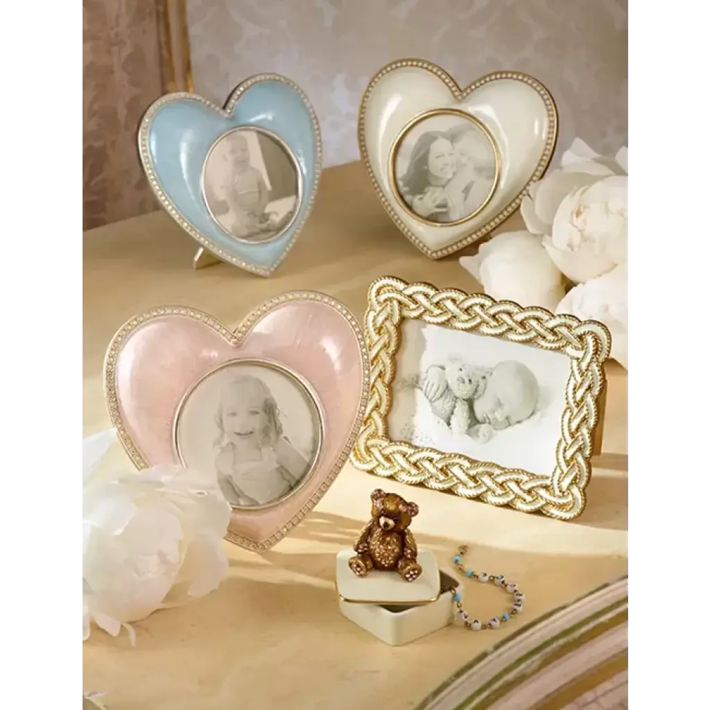 Place the object of your affection in the sweetly shaped Chantal Heart Frame, finished in silver tones, painted in pale blue enamels, and hand-set with opal-colored crystals.