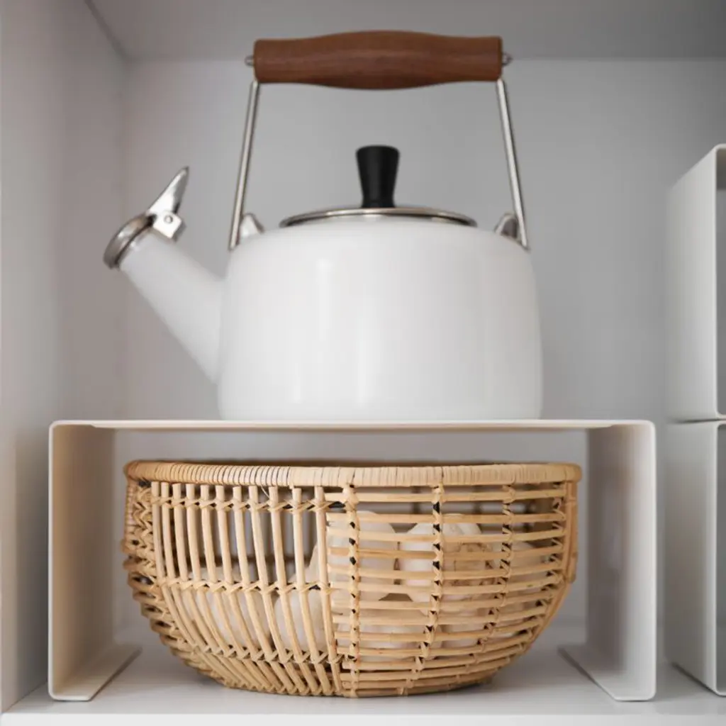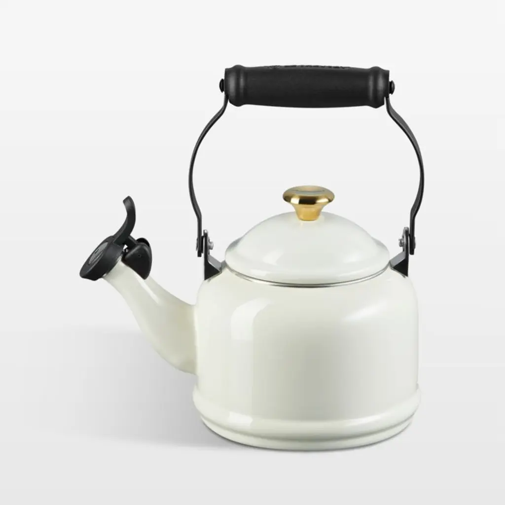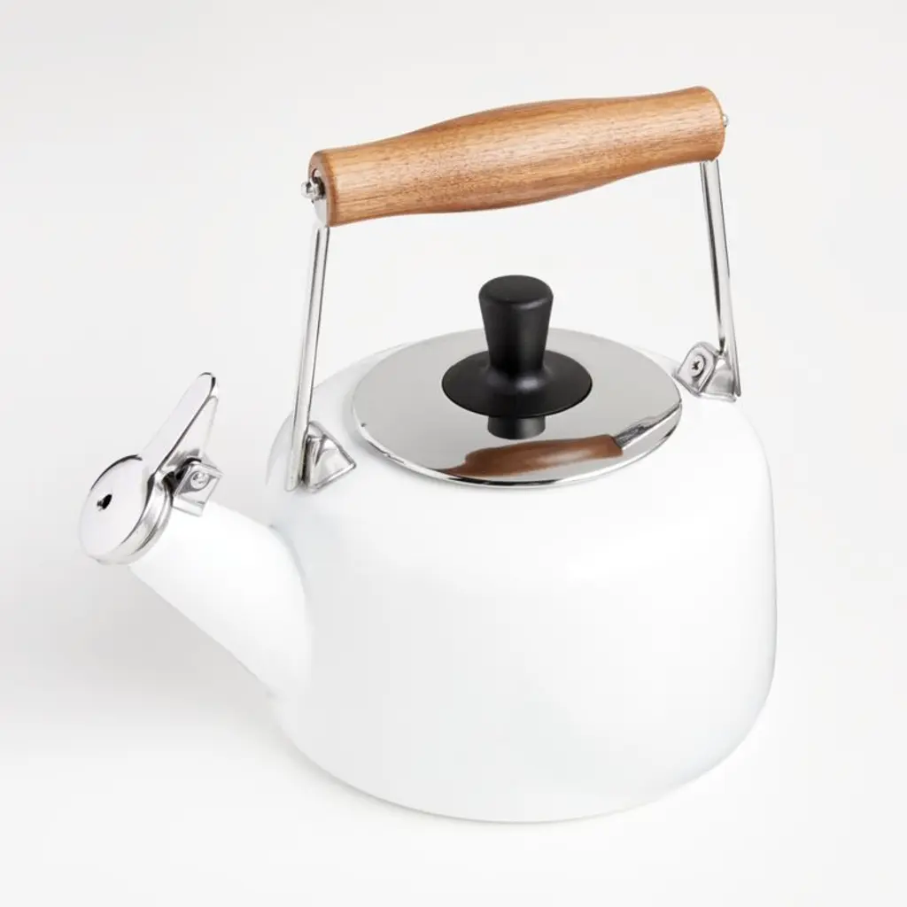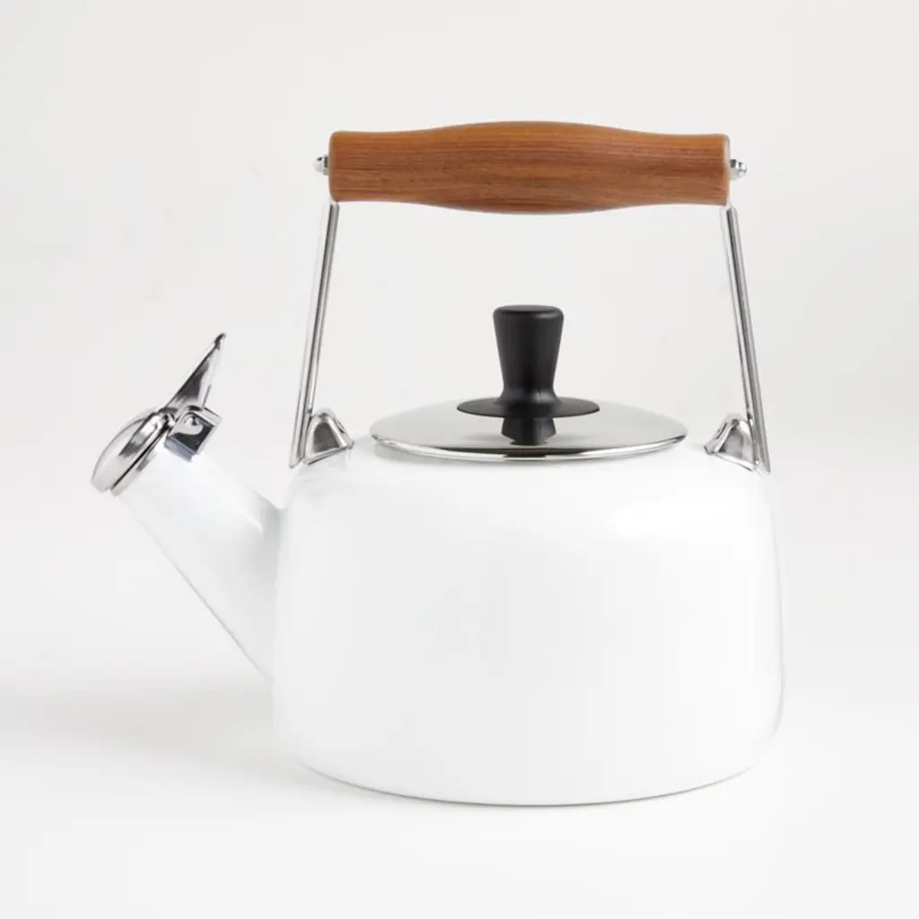 Chantal riffs on its vintage-inspired tea kettle in this exclusive design destined to become a Crate and Barrel classic. The kettle refines its traditional curves with clean lines and a Scandinavian-inspired mix of a matte white enamel and warm walnut handle. Constructed as one piece, the carbon steel kettle eliminates interior seams to prevent rust. Listen for its beckoning whistle as you prepare tea or pour-over coffee. Suitable for all cooktops, including magnetic induction, electric and gas.