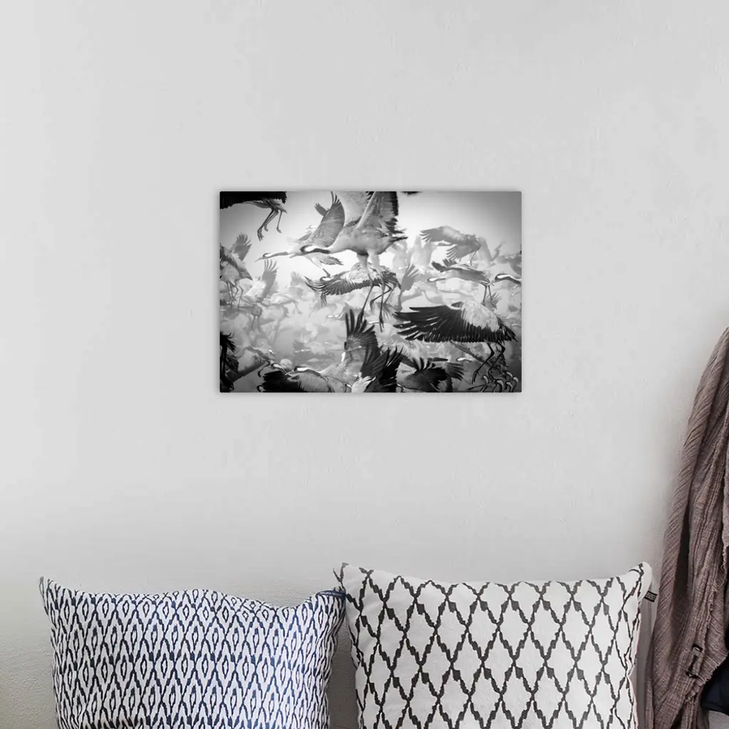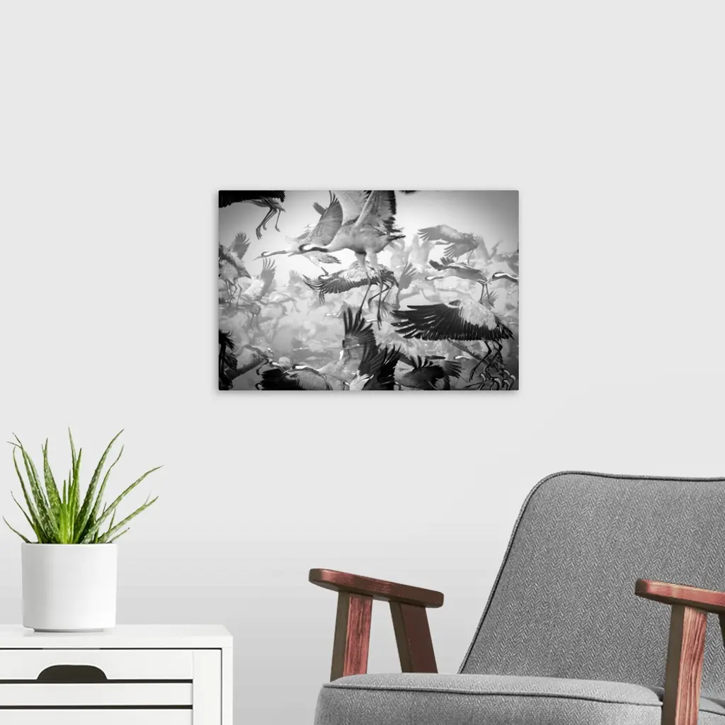 Flock of Common Cranes taking flight, creating a flurry of legs and wings.