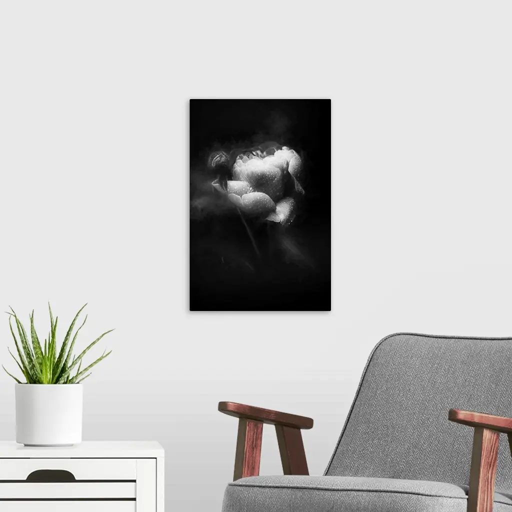 Soft focus black and white image of a rose covered in water droplets and smoke around the sides giving it a dreamy look.