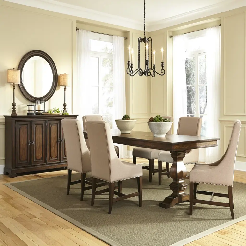 The Chapleau III Black Wood Extendable Double Pedestal Dining Set is perfect for hosting large gatherings. This traditional dining set includes a rectangular table that extends from 92 to 120 inches, accommodating up to 10 people comfortably. The set features a combination of side chairs and armchairs, all with cushioned seats for added comfort.