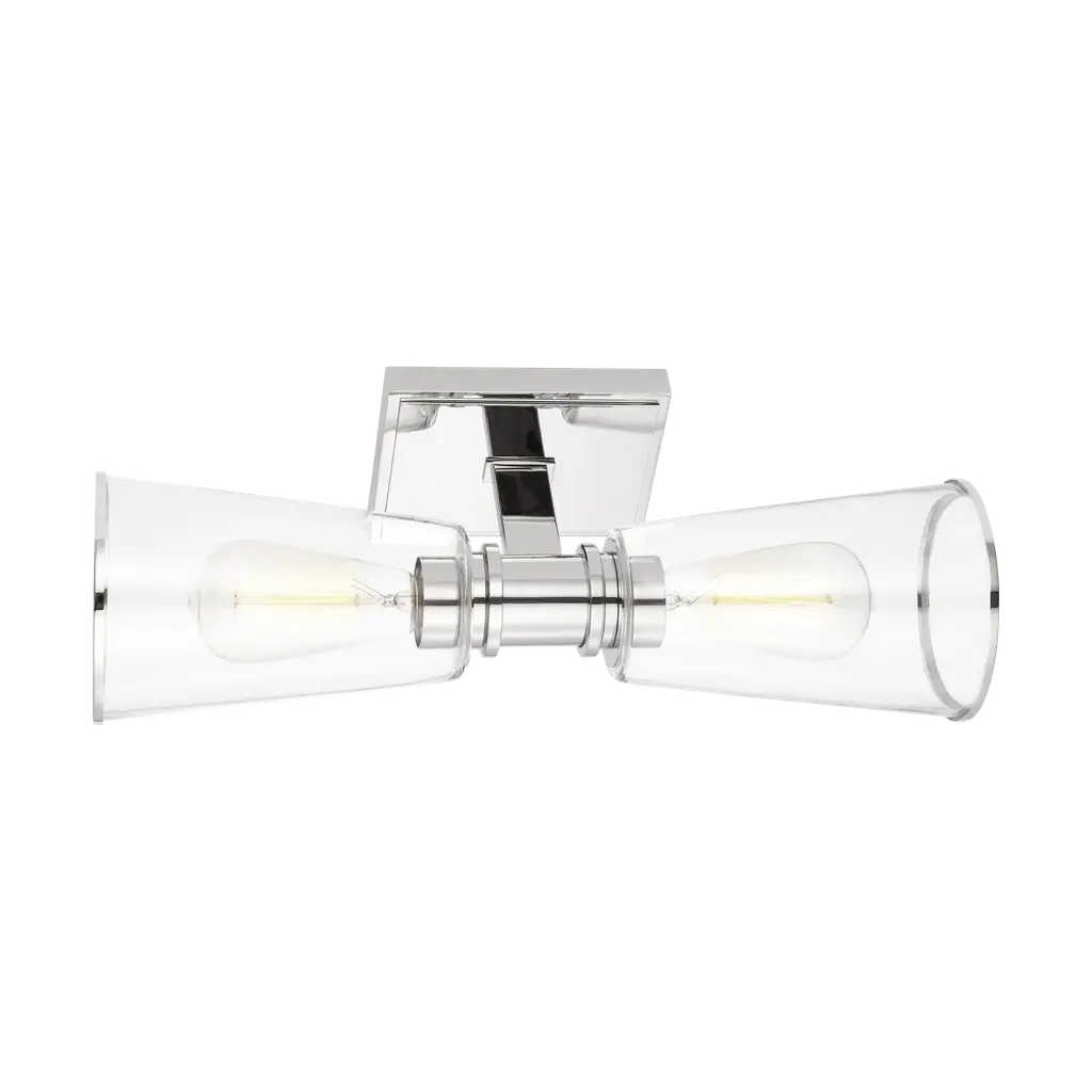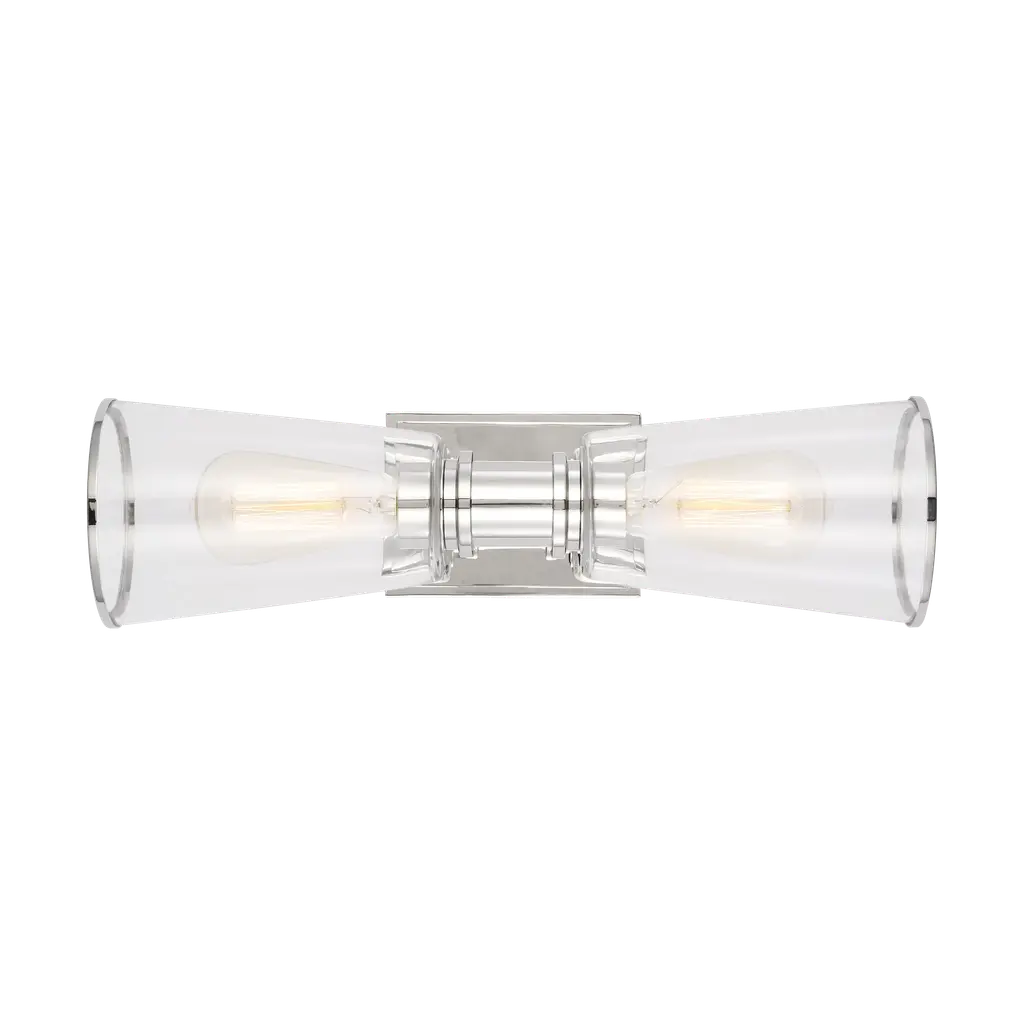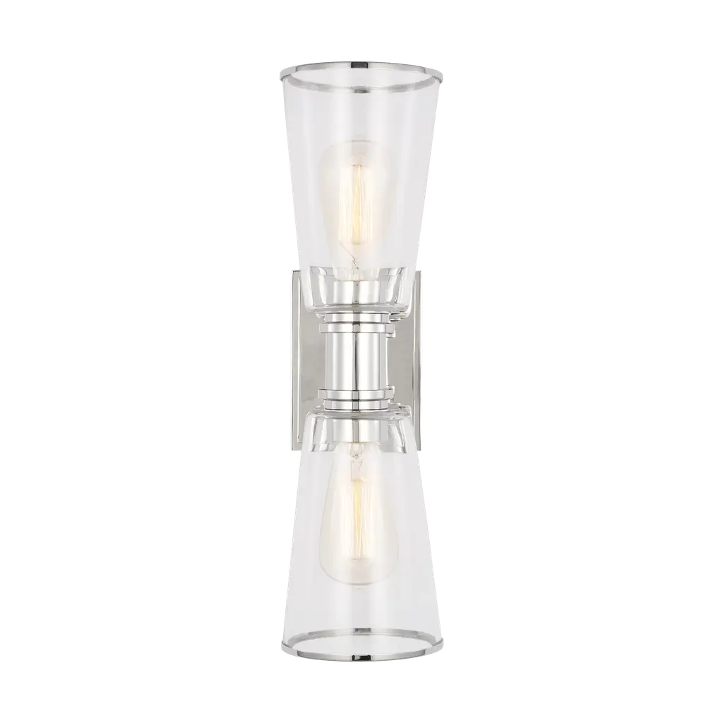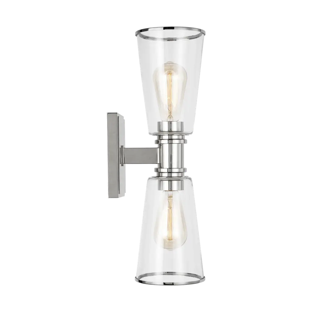 Sophisticated and modern with an industrial edge, the Alessa vanity series is crafted of steel with a Burnished Brass or Polished Nickel finish. Designed by Chapman & Myers, the Alessa two light wall sconce in polished nickel is a Simple glass bathroom collection with rectangular metal arms and tapered clear glass shades. The conical clear glass shades replicate and frame the shape of the inner filament bulb. Each shade is supported by a rectangular metal arm and is capped with a thin metal rim. Sleek, minimalist fixture will complement hallways, powder rooms, and bathrooms Uses (2) 75-watt medium base light bulbs sold separately; LED compatible. Available Finishes: Burnished Brass and Polished Nickel. Damp Rated. Finish: Polished Nickel Family: Alessa Designer: Chapman & Myers Category: Wall Bath Fixture Dimensions: W:5'' H:17 7/8'' E:7 1/8'' Shade/Glass: clear glass shades Lamping: 2 A19 Medium 75 watt light bulbs Voltage: 120 Number of Bulbs: 2 Max Wattage: 60 Bulb Included: No Safety Rating Location: damp