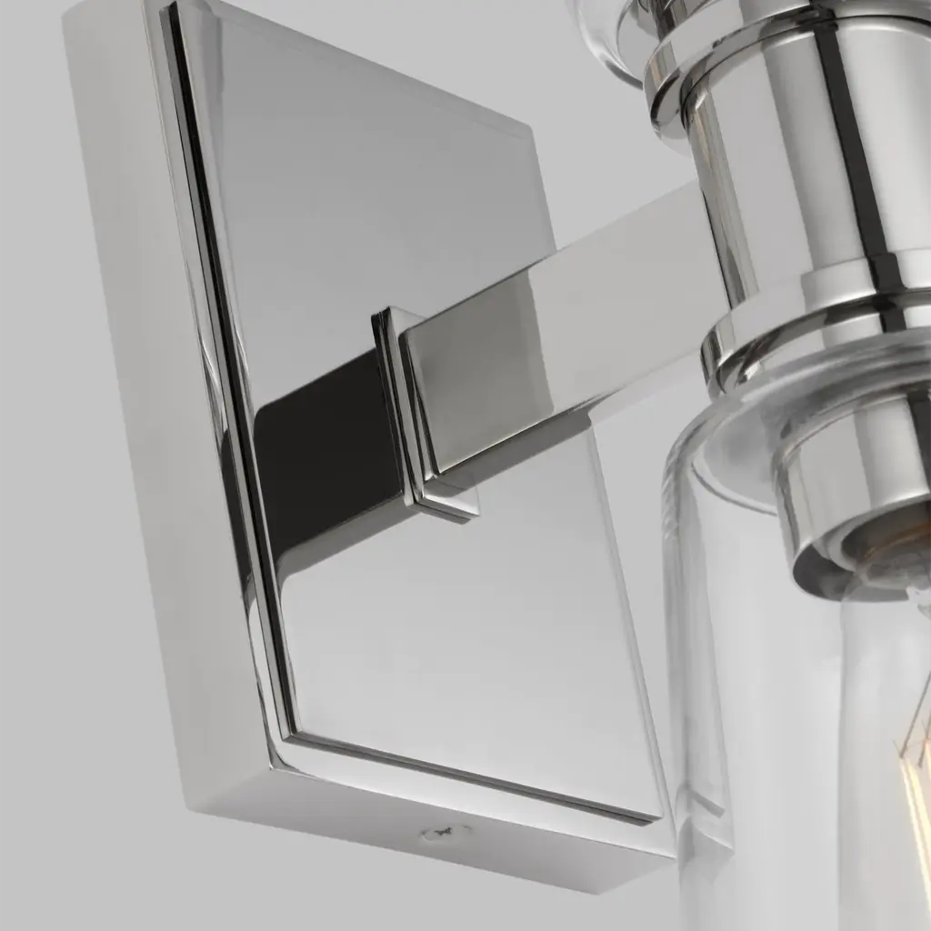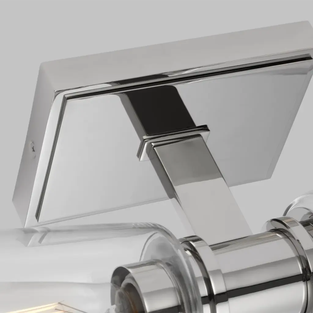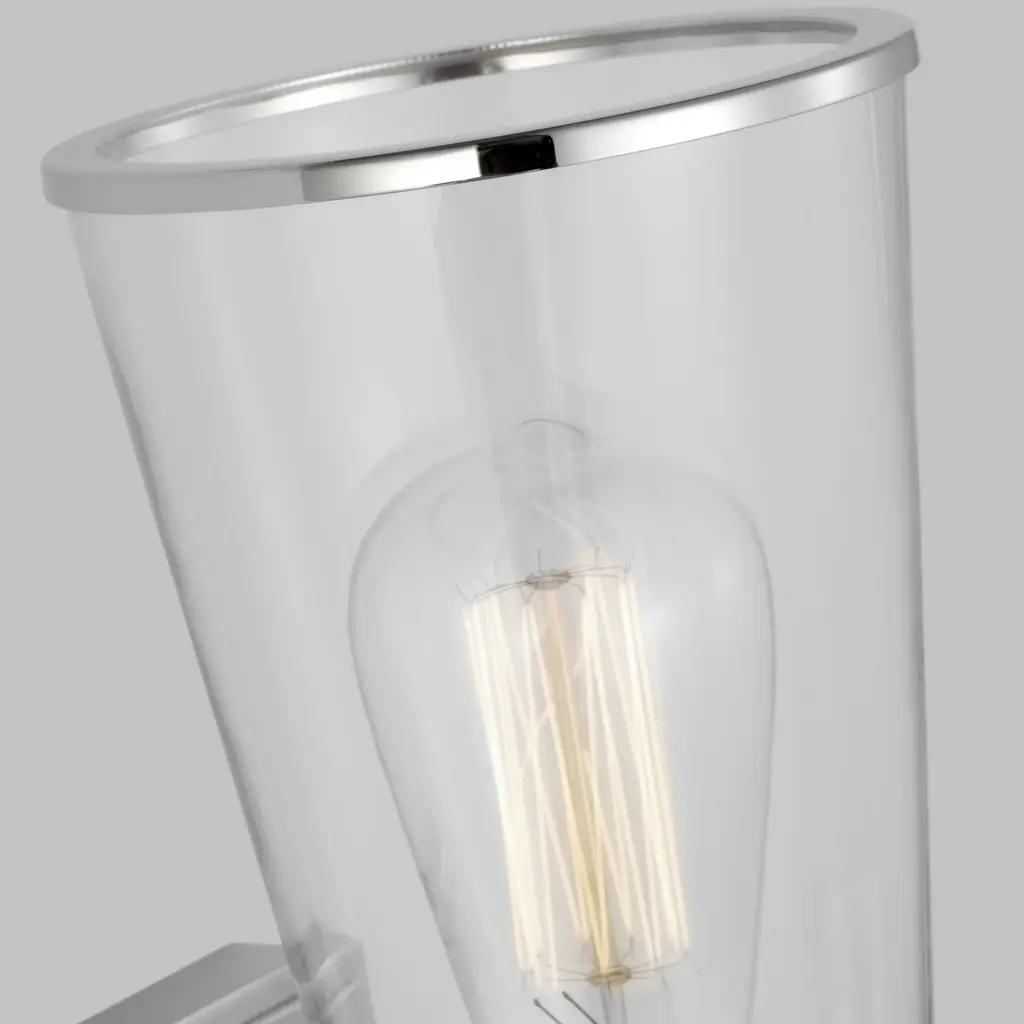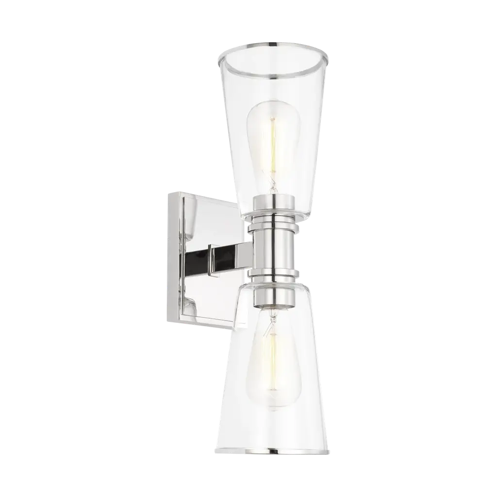 Sophisticated and modern with an industrial edge, the Alessa vanity series is crafted of steel with a Burnished Brass or Polished Nickel finish. Designed by Chapman & Myers, the Alessa two light wall sconce in polished nickel is a Simple glass bathroom collection with rectangular metal arms and tapered clear glass shades. The conical clear glass shades replicate and frame the shape of the inner filament bulb. Each shade is supported by a rectangular metal arm and is capped with a thin metal rim. Sleek, minimalist fixture will complement hallways, powder rooms, and bathrooms Uses (2) 75-watt medium base light bulbs sold separately; LED compatible. Available Finishes: Burnished Brass and Polished Nickel. Damp Rated. Finish: Polished Nickel Family: Alessa Designer: Chapman & Myers Category: Wall Bath Fixture Dimensions: W:5'' H:17 7/8'' E:7 1/8'' Shade/Glass: clear glass shades Lamping: 2 A19 Medium 75 watt light bulbs Voltage: 120 Number of Bulbs: 2 Max Wattage: 60 Bulb Included: No Safety Rating Location: damp