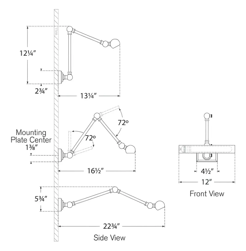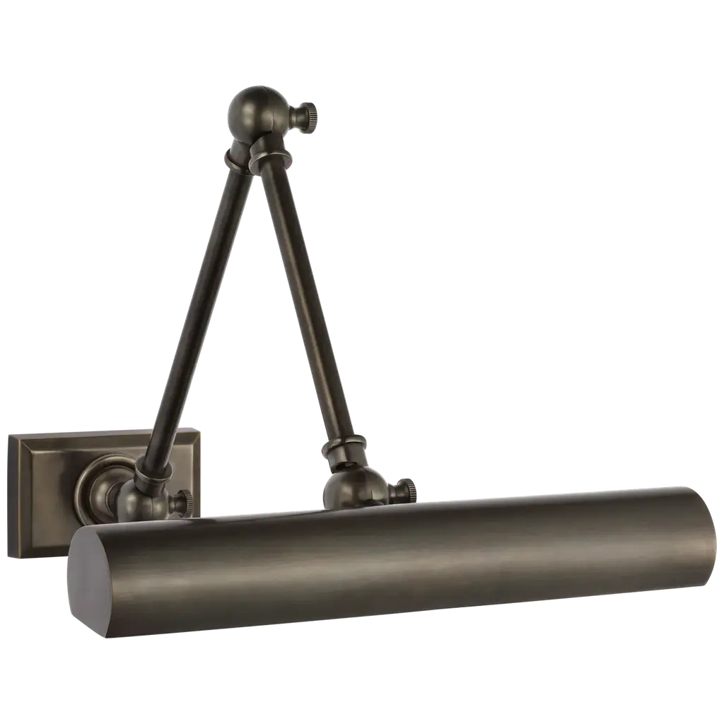 Cabinet Maker 12" Double Library Light in Bronze Designer: Chapman & Myers Height: 5.75" - 12.25" Extension: 13.25" - 22.75" Backplate: 2.75" x 4.5" Rectangle Mounting: Convertible Socket: E26 Keyless w/ Line Switch Wattage: 8 LED T10 Safety Rating Location: Dry Note: Requires Smaller Outlet Box Portable: Switch on Cord 18" from Backplate