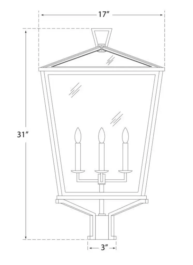 Darlana Post Light in Bronze Designer: Chapman & Myers Height: 31" Base: 3" Round Post Cap Mounting: Post Shade Detail: Clear Glass Socket: 4 - E12 Candelabra Wattage: 4 - 60 C11 Safety Rating Location: WET