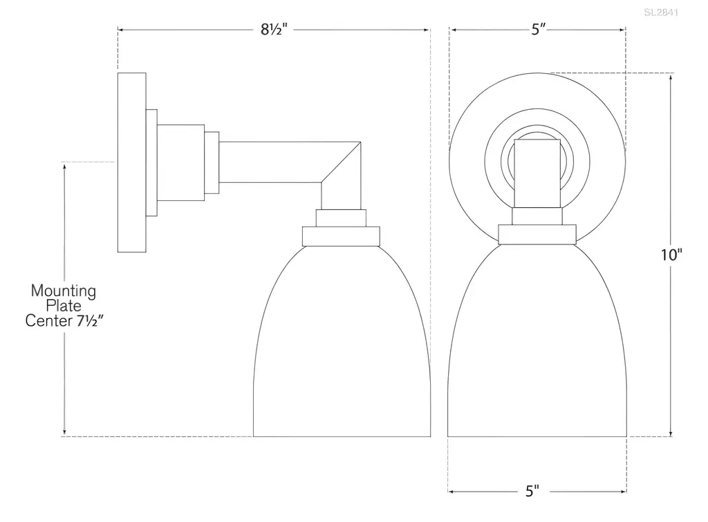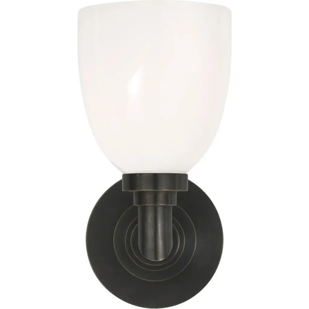 Wilton Single Bath Light in Bronze with White Glass Designer: Chapman & Myers Height: 10.25" Extension: 8.75" Backplate: 5" Round Mounting: Hardwire Shade Detail: White Glass Socket: E26 Keyless Wattage: 60 A19 Safety Rating Location: DAMP