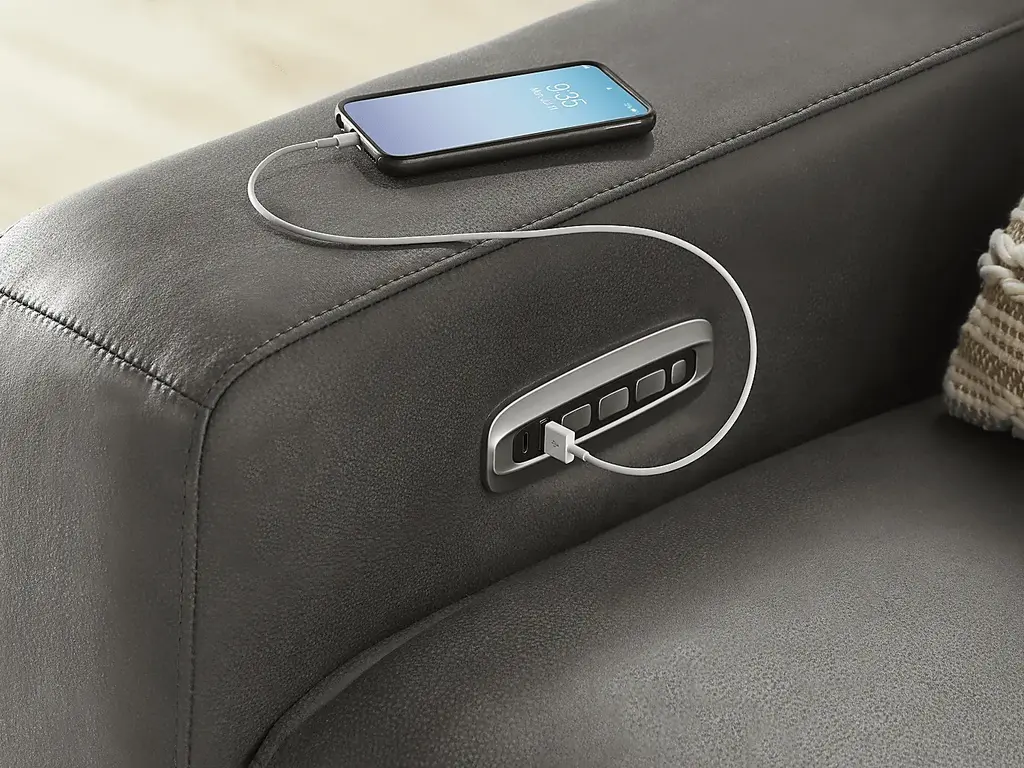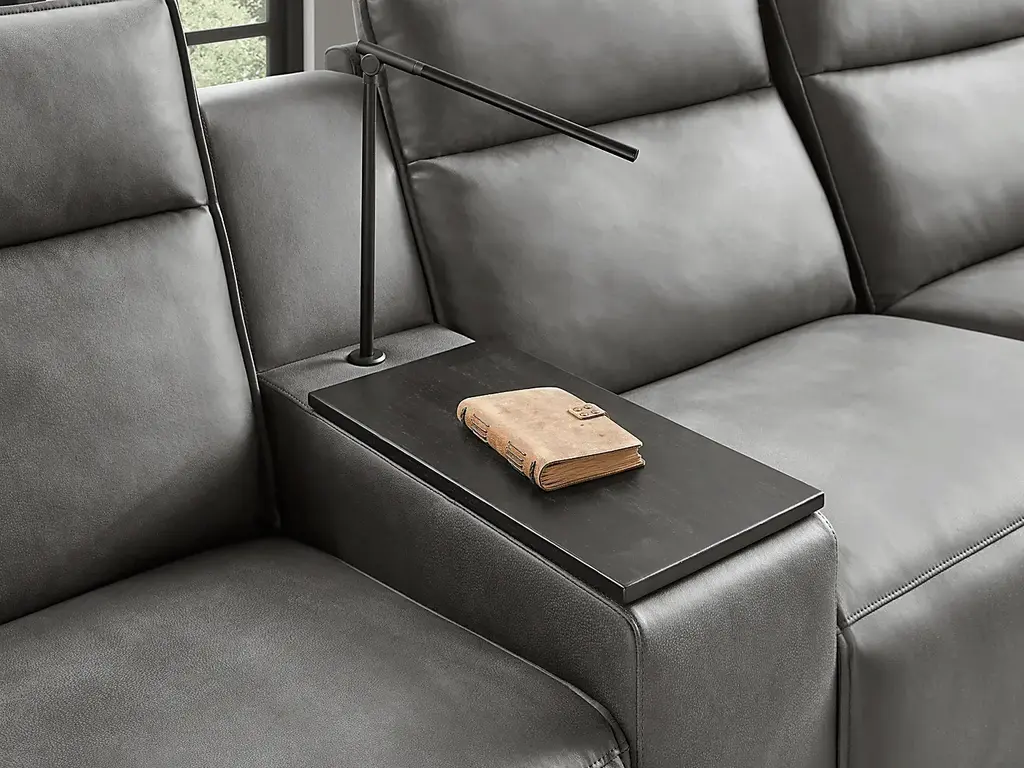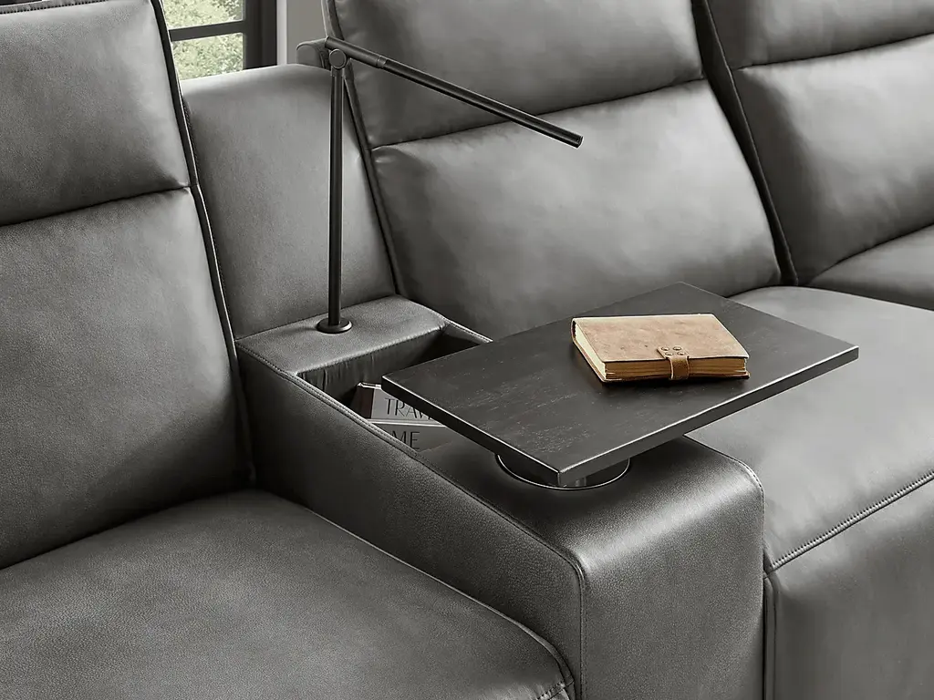 Discover the unlimited possibilities of the dual power reclining ModularTwo, thoughtfully designed with both comfort and flexibility in mind. Contemporary in style and upholstered in a plush suede-soft charcoal colored microfiber, its tailored silhouette is enhanced by welted track arms and tufted back cushions for a look of refined elegance and serenity. Each piece is upholstered on all sides, offering endless opportunities for both reconfiguration as well as individual use. Dual power reclining functionality allows for easy adjustment in the headrest and back, providing the ultimate in personalized comfort. The two consoles include touch-activated reading lights and swivel-top wood tables with hidden storage for easy access to your lounging essentials. Select a preconfigured design or visit a showroom to learn about individual components and create the modular solution perfect for your space and style. Upholstery: 100% Polyester