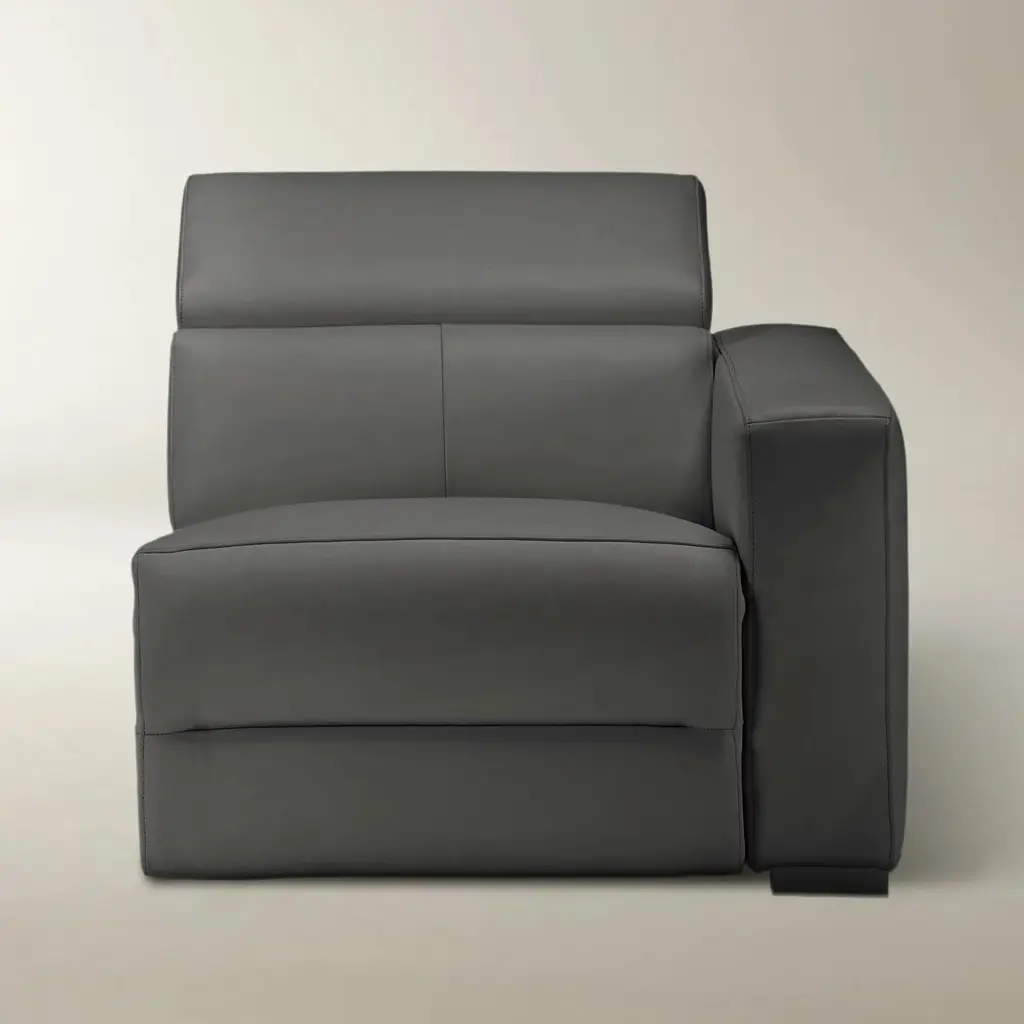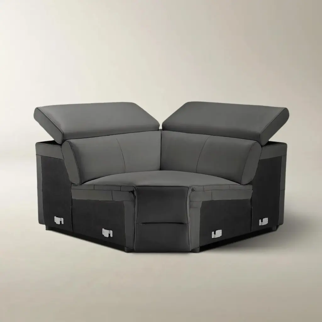 Discover the unlimited possibilities of the dual power reclining ModularTwo, thoughtfully designed with both comfort and flexibility in mind. Contemporary in style and upholstered in a plush suede-soft charcoal colored microfiber, its tailored silhouette is enhanced by welted track arms and tufted back cushions for a look of refined elegance and serenity. Each piece is upholstered on all sides, offering endless opportunities for both reconfiguration as well as individual use. Dual power reclining functionality allows for easy adjustment in the headrest and footrest, providing the ultimate in personalized comfort. The two consoles include touch-activated reading lights and swivel-top wood tables with hidden storage for easy access to your lounging essentials. Select a preconfigured design or visit a showroom to learn about individual components and create the modular solution perfect for your space and style. Upholstery: 100% Polyester.