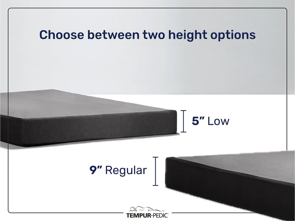 Engineered to support your Tempur-Pedic® mattress — and upholstered in matching grey fabric — with a perfectly solid, flat surface at a height that’s right for you. 9” High matches a traditional box-spring height. 5” Low fits through more narrow stairways.