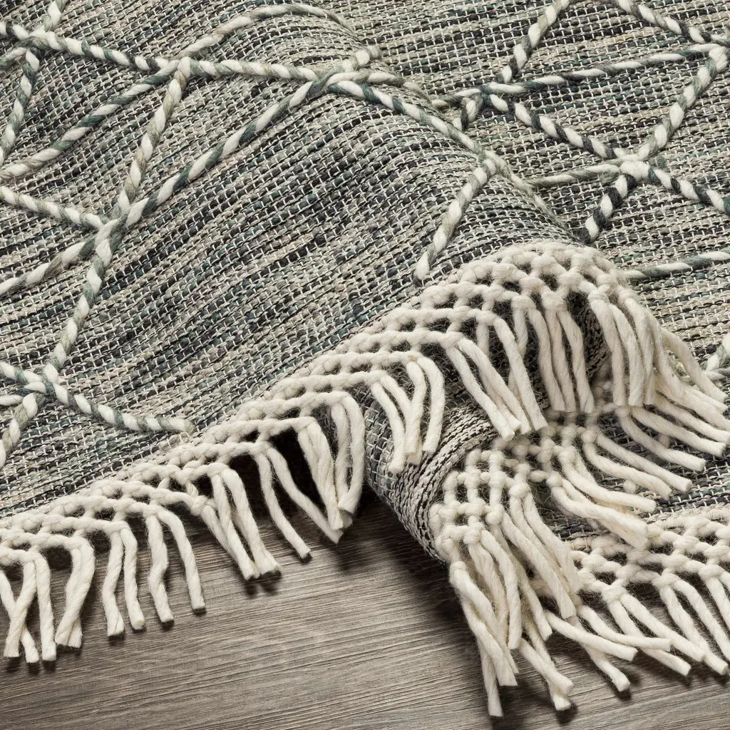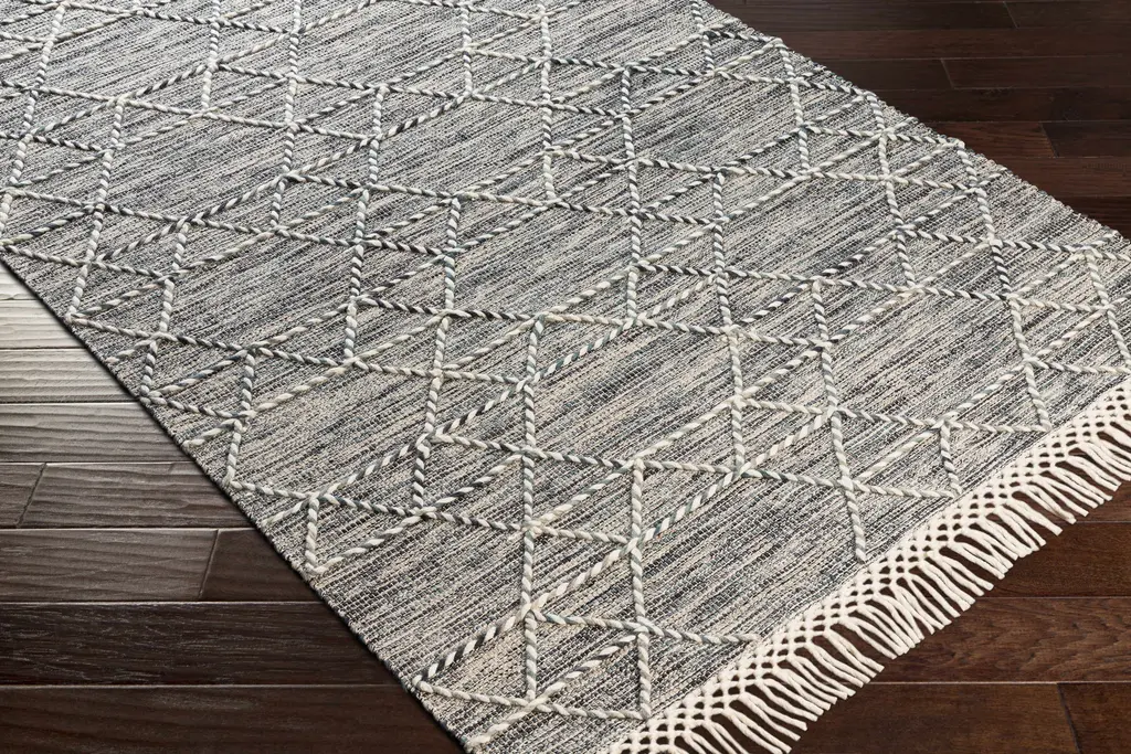 Collection: Sapadun Colors: Charcoal, Cream, Gray, Sage, Black Construction: Hand Woven Material: 70% Wool, 30% Polyester Pile: No Pile Styles: Transitional,Traditional Made In: India Thickness: 0.62" Fringe Length: 3" Price Range: $$$$$ (Most Affordable)
