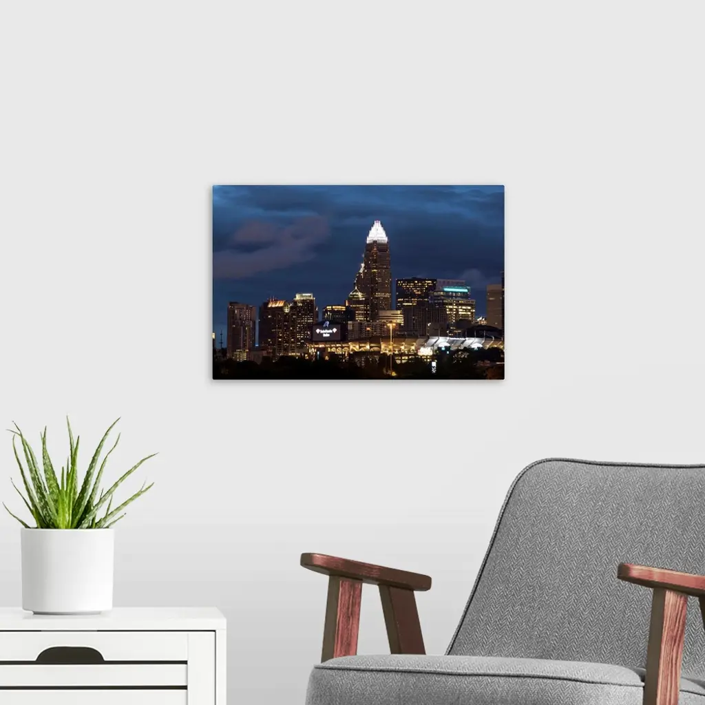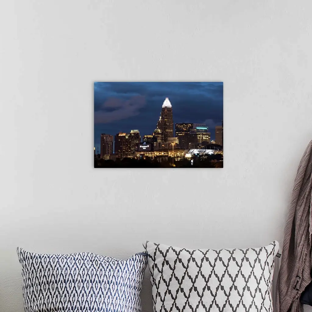 Horizontal image of the city of Charlotte, North Carolina at night.