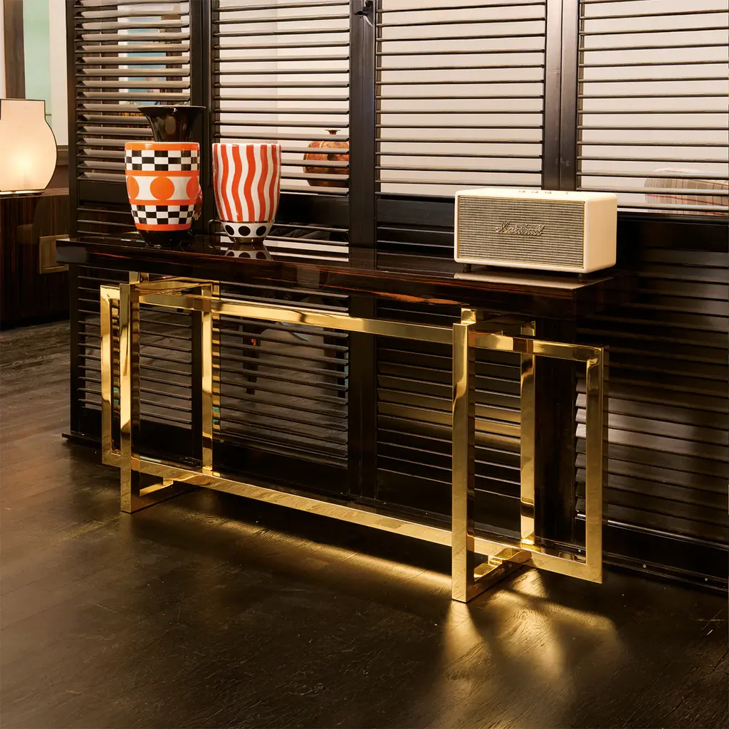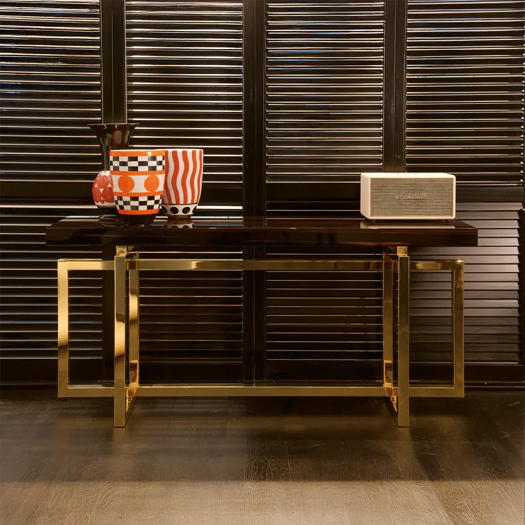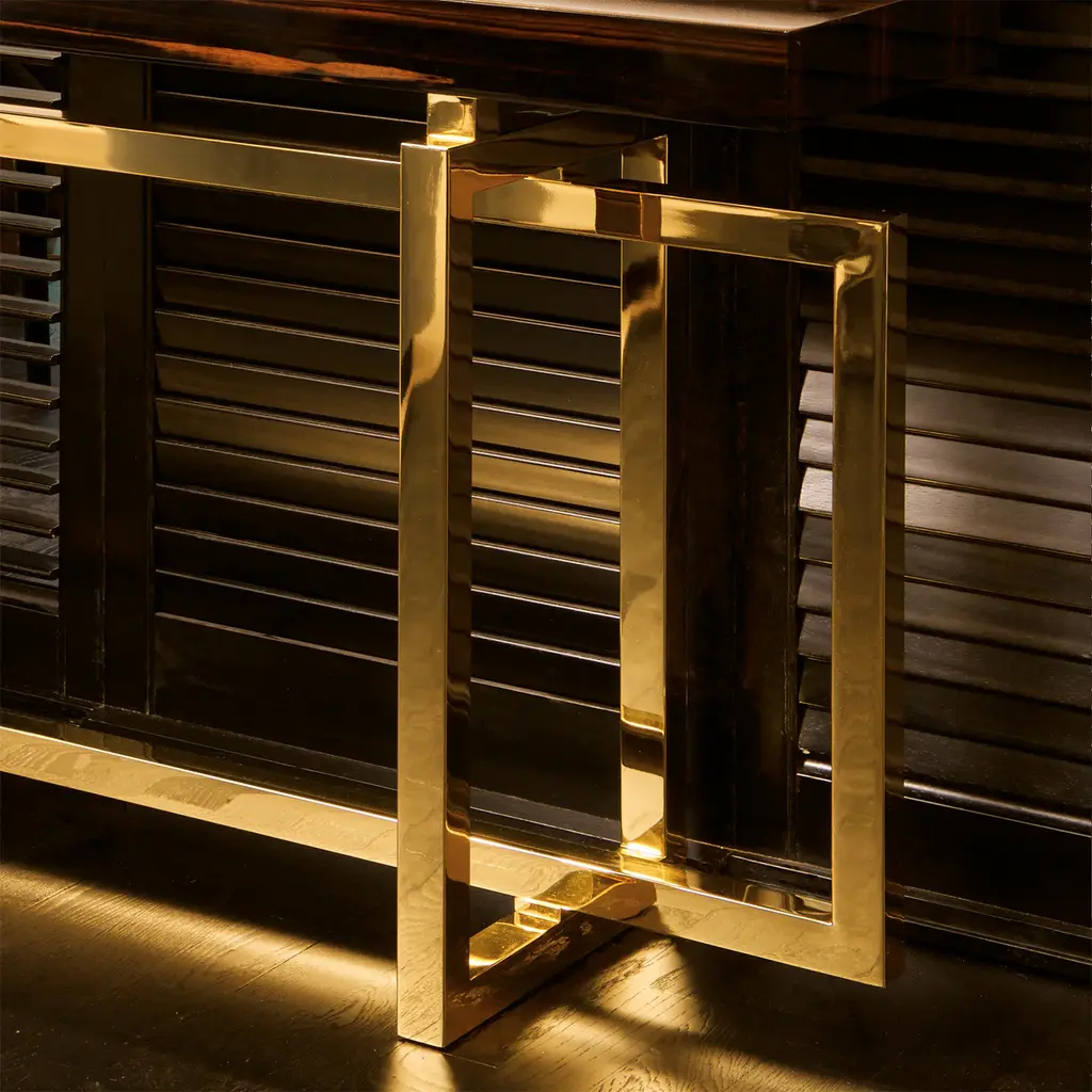 This striking console will set the tone, welcoming every guest as entryway focal point in a modern home. Boasting a rigorous geometric silhouette and the contrast of a glossy brass-plated metal base with the solid Macassar ebony 7 cm-thick top, this piece is a study in opposites, creating a dynamic silhouette that is both sculptural and light. This eye-catching object of functional decor can also make a small desk or a unique display surface in a living room.