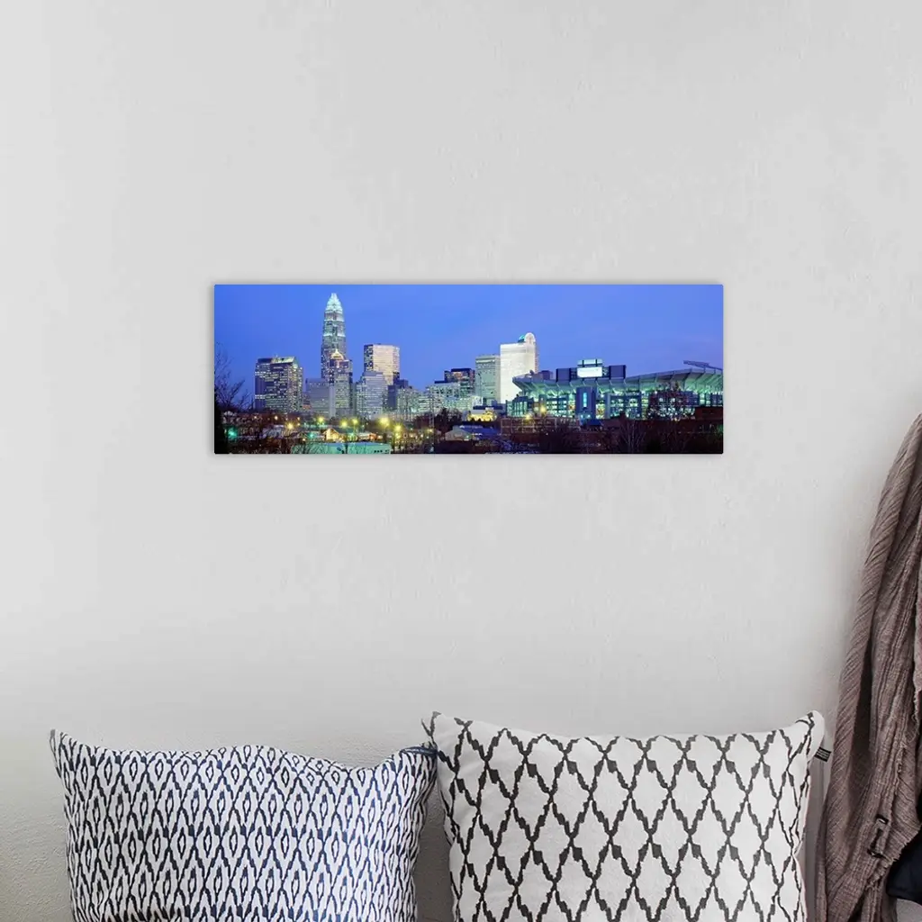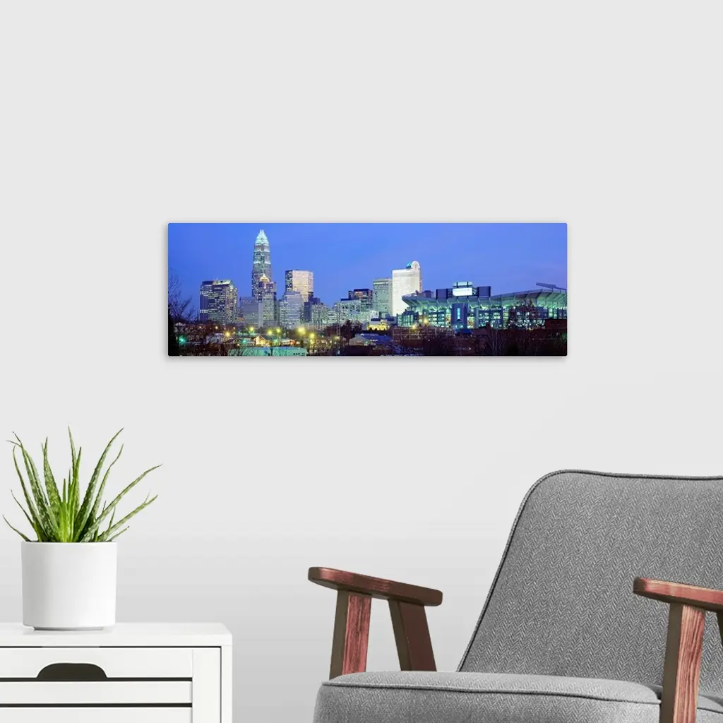Panoramic cityscape photograph of the Queen City downtown at twilight.