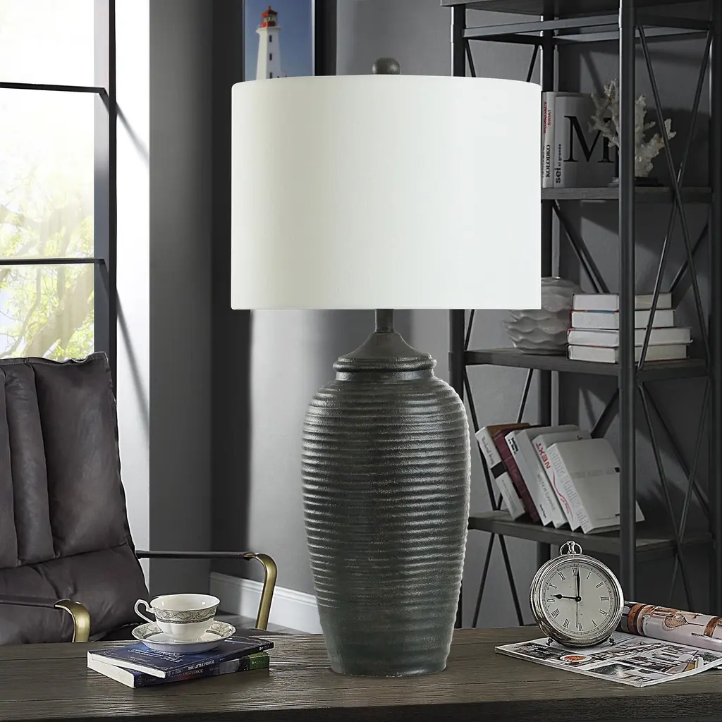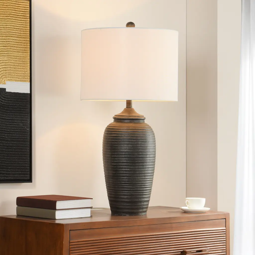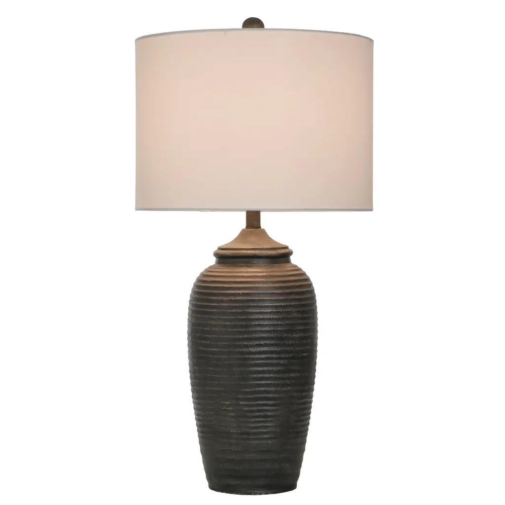 This lamp is specially designed to spice up your room by incorporating texture and dimension into your space. This piece is made from polyresin and has a distressed speckled cream finish giving it a rustic feel. Place along side a variety of home decor with its easy to style neutral color palette.Due to the production process, each piece is unique and no two are exactly alike.This stylish decorative table lamp is the best choice for your room if you are looking to find a piece that is textured and versatile.The polyresin base has a textured/multi-neutral colored finish and features a beautiful linen drum shade.Weight: 9.5 poundsSocket Type: E26Socket Quantity: 1