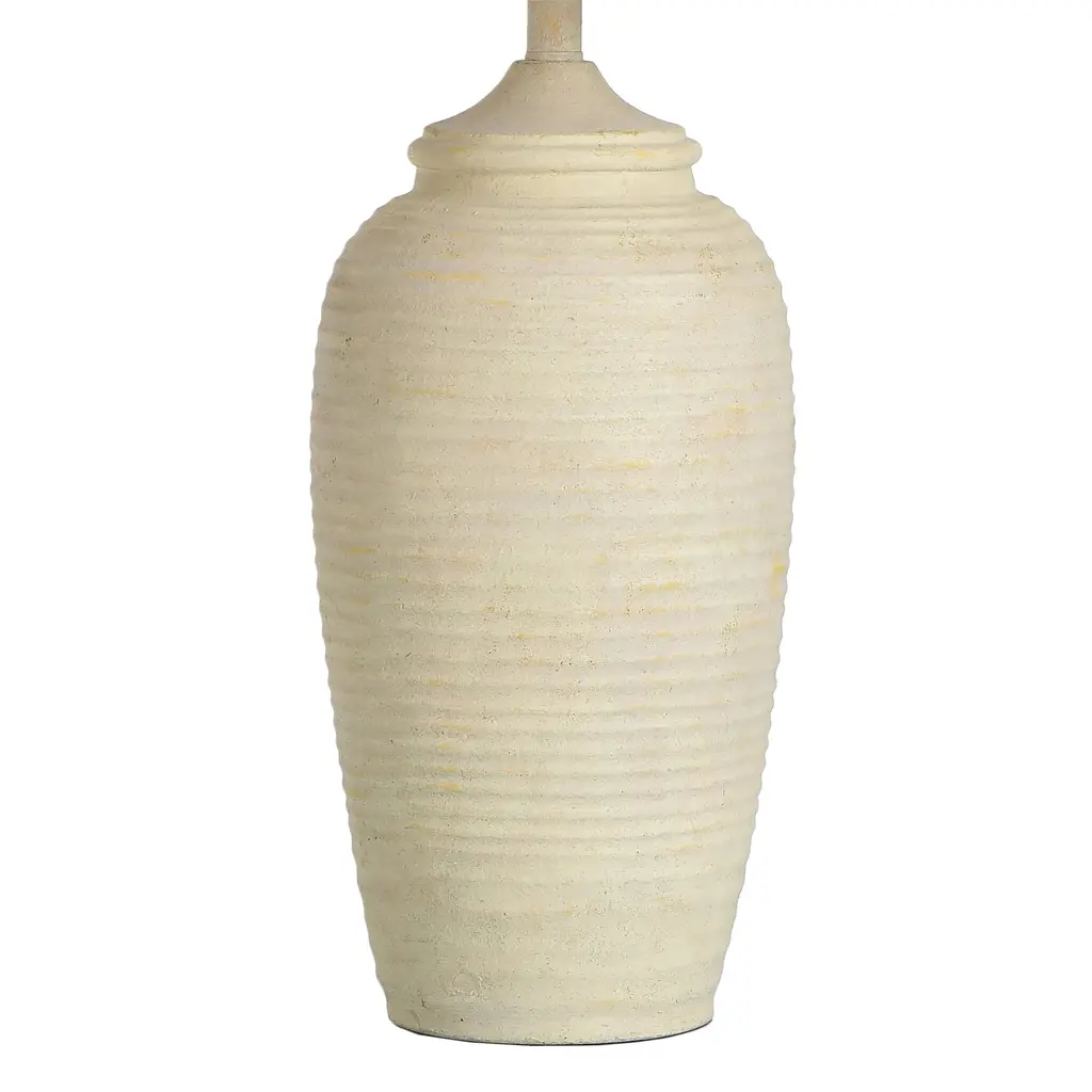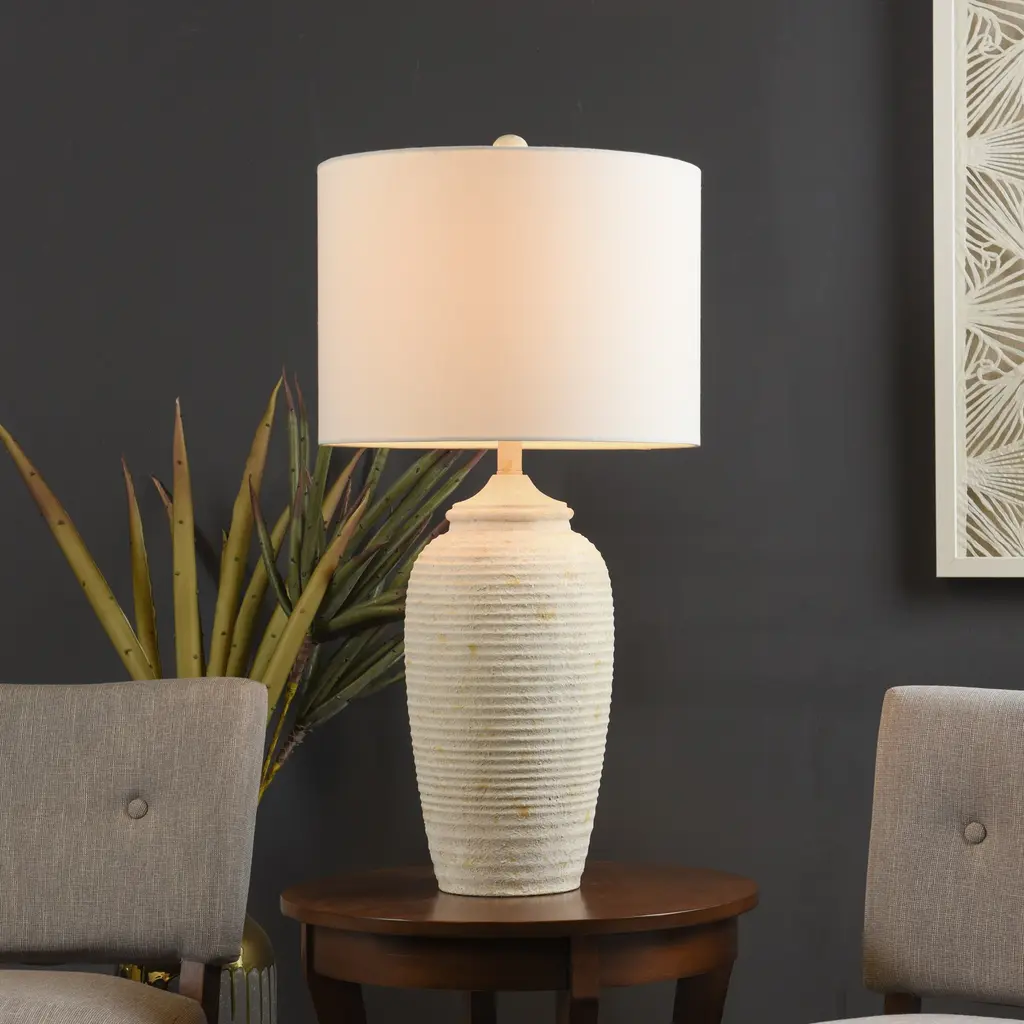 This lamp is specially designed to spice up your room by incorporating texture and dimension into your space. This piece is made from polyresin and has a distressed speckled cream finish giving it a rustic feel. Place along side a variety of home decor with its easy to style neutral color palette.Due to the production process, each piece is unique and no two are exactly alike.This stylish decorative table lamp is the best choice for your room if you are looking to find a piece that is textured and versatile.The polyresin base has a textured/multi-neutral colored finish and features a beautiful linen drum shade.Weight: 9.5 poundsSocket Type: E26Socket Quantity: 1