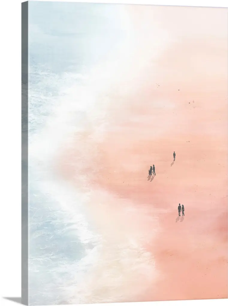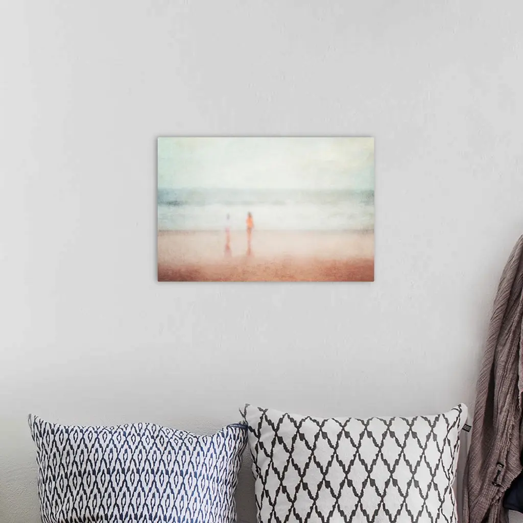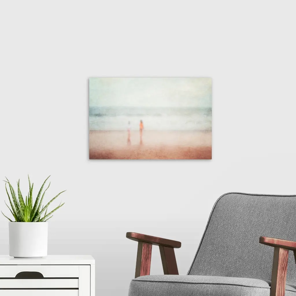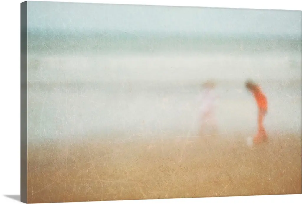 A vintage seaside holiday vacation dream image of two children playing on a beach in blurry soft focus.