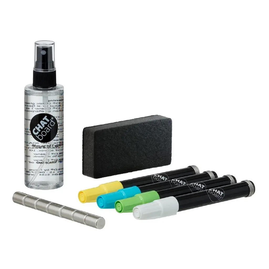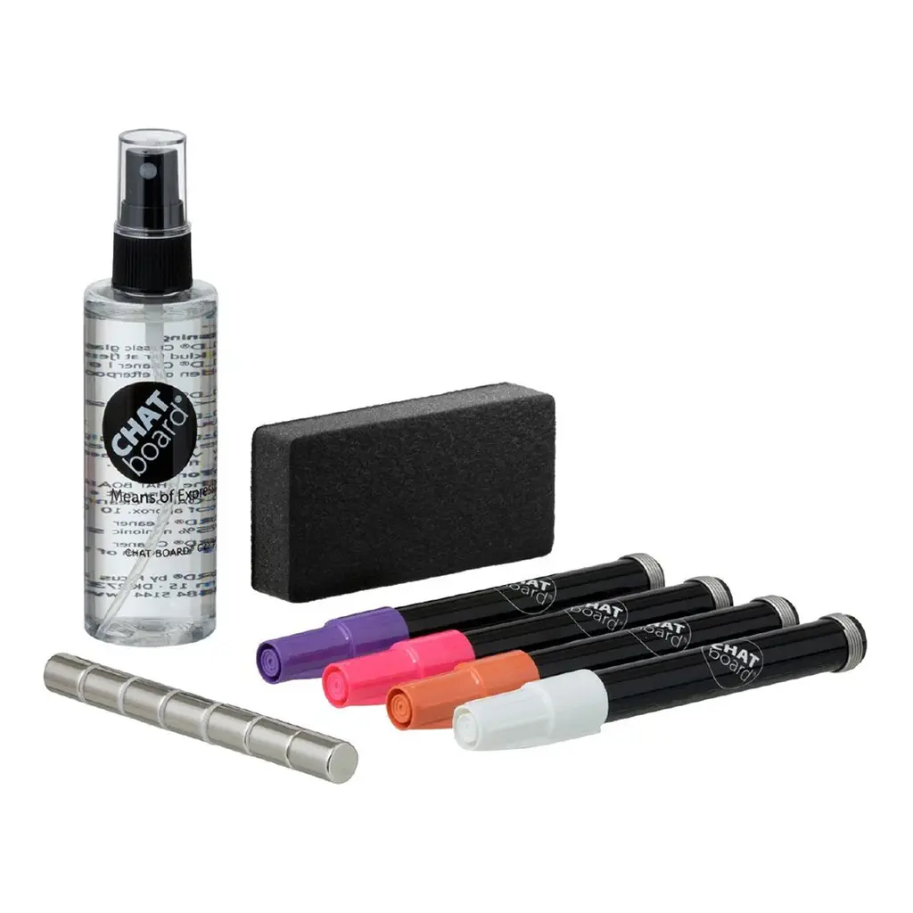 Classic Set 1 Includes: 1 Eraser, 1 Bottle of Cleaner, 4 Dry Erase Pens (black, red, blue, green), 7 Chrome Magnets Neon Set 1 Includes: 1 Eraser, 1 Bottle of Cleaner, 4 Neon Dry Erase Pens (blue, green, yellow, white), 7 Chrome Magnets Neon Set 2 Includes: 1 Eraser, 1 Bottle of Cleaner, 4 Neon Dry Erase Pens (pink, purple, orange, white), 7 Chrome Magnets