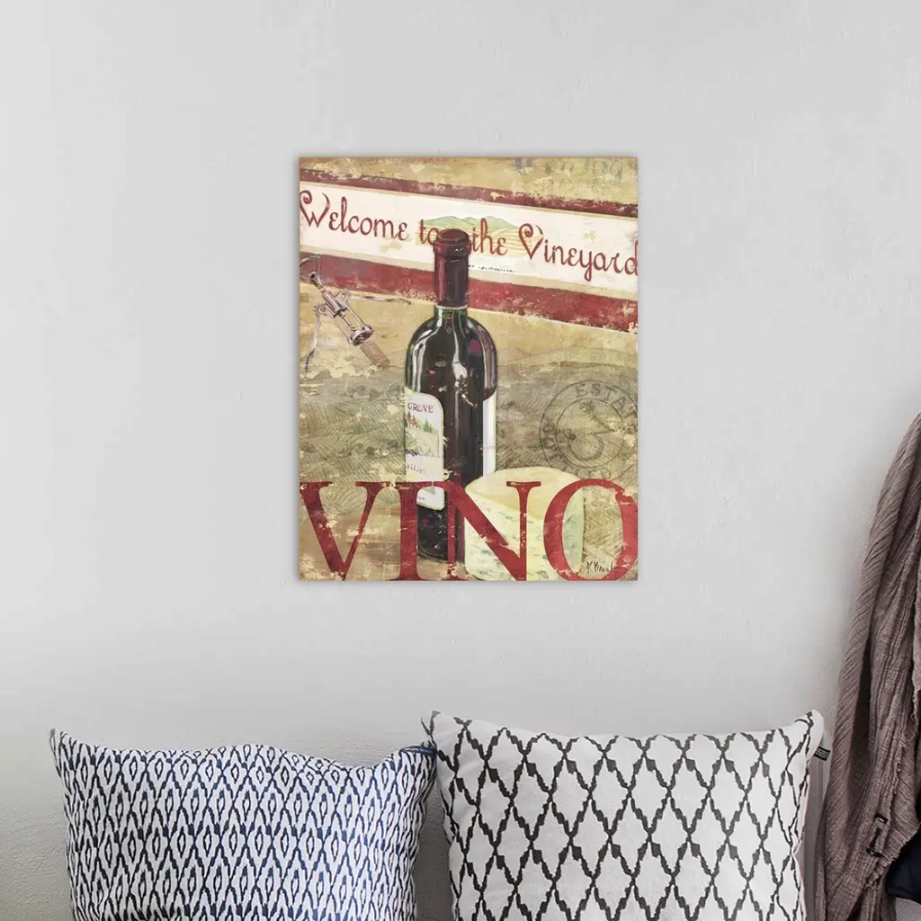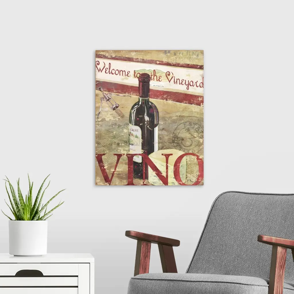 Welcome sign featuring a bottle of red wine and cheese, with the word Vino.