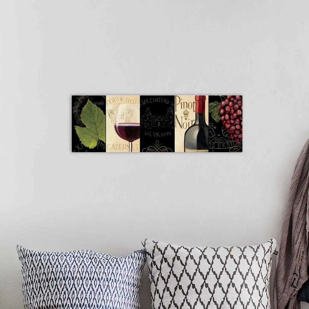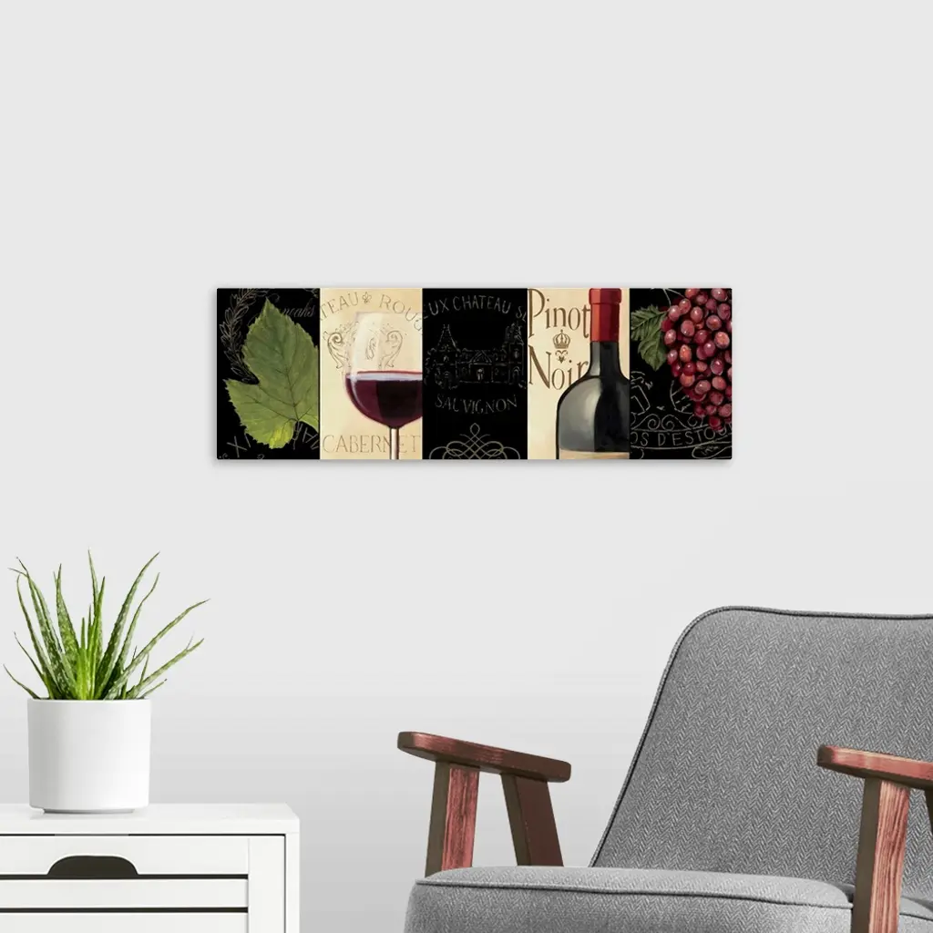 Large, horizontal , decorative wall hanging of five vertical panels side by side, each with different imagery related to wine. Images include the leaf from a vine, a glass of red wine, a partial bottle of wine, a bunch of grapes, and each image has wine names or French text on it.