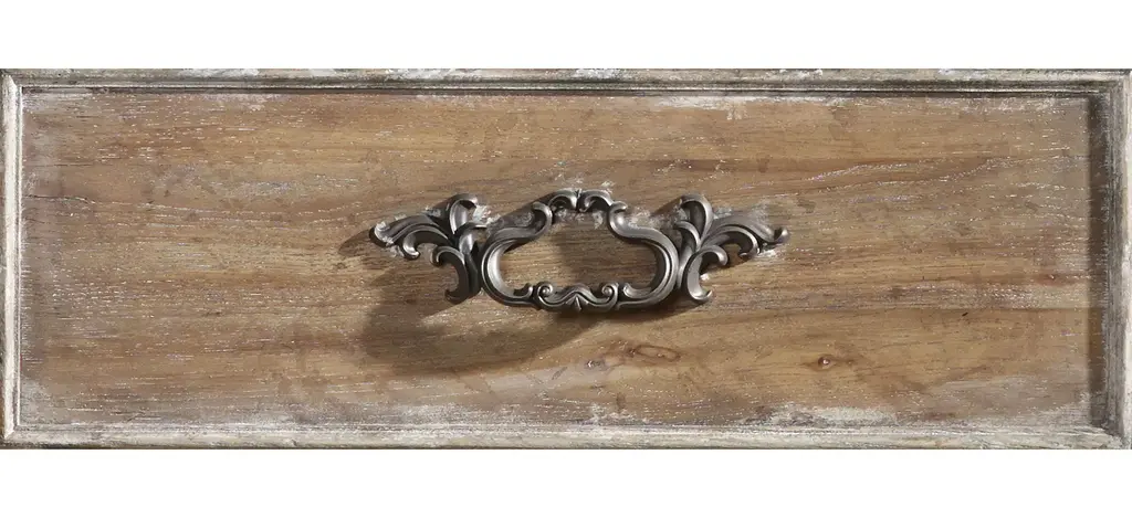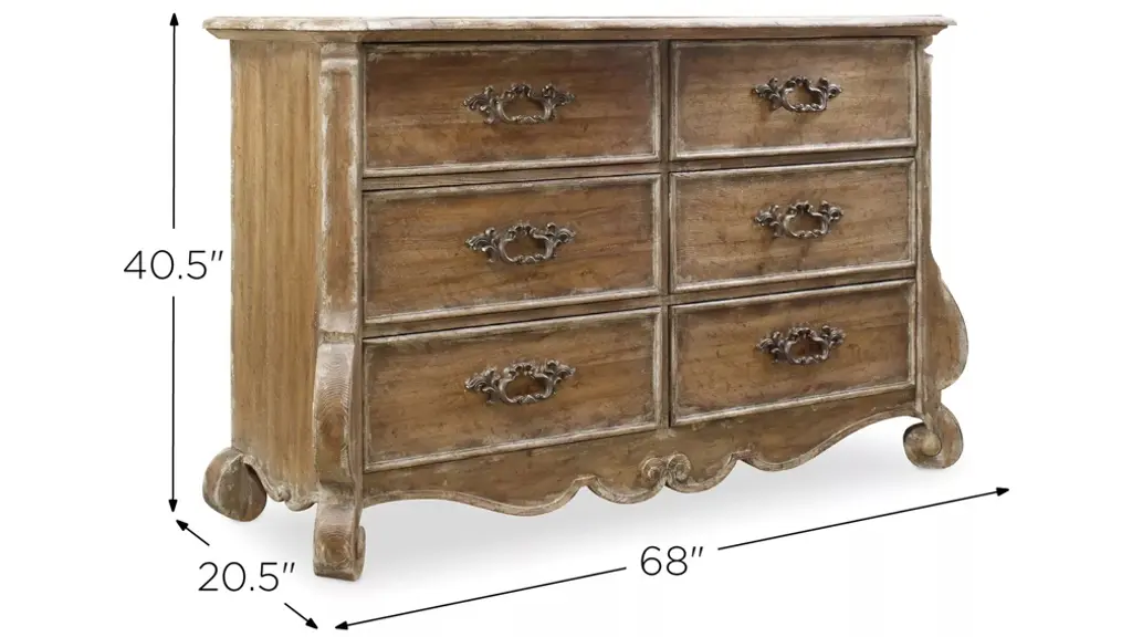 A vision of romantic style with its scalloped base, turned legs and elegant hardware, the Chatelet Dresser is finished in Caramel Froth, a soft amber color with a touch of aged white paint to highlight distinctive grains and moldings. The six drawers include a drop-in felt liner for the top two drawers and cedar lining in the two bottom drawers.