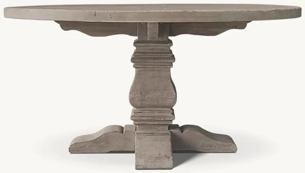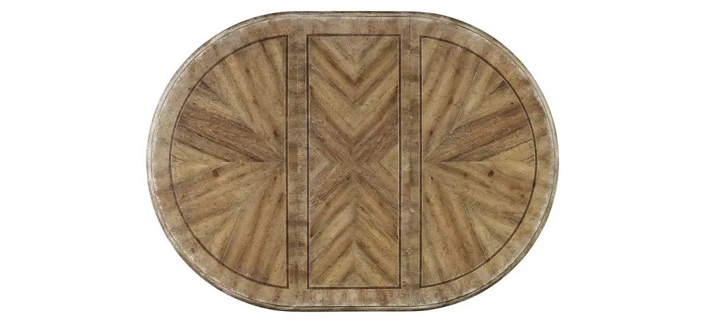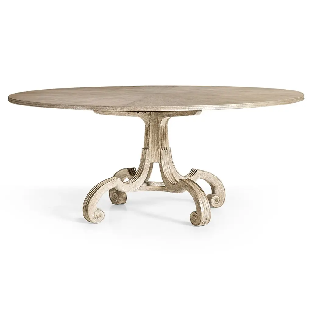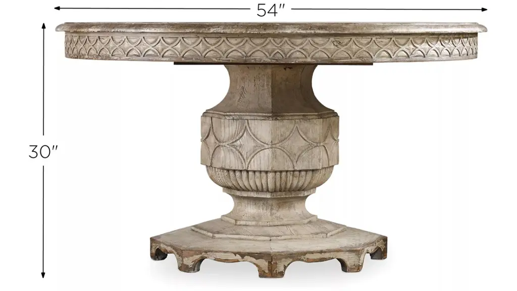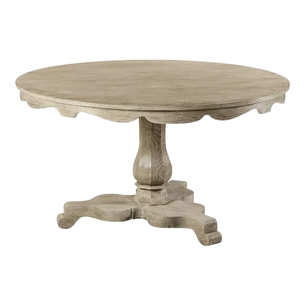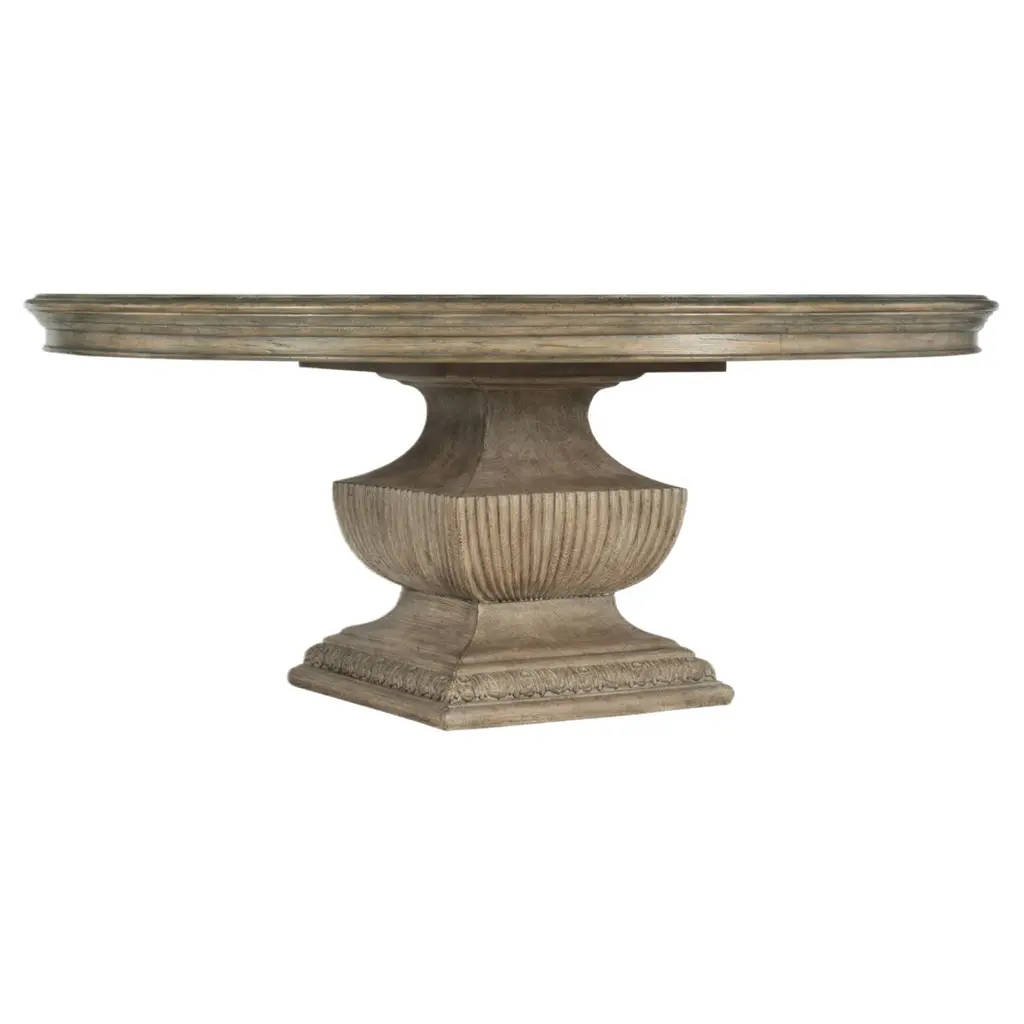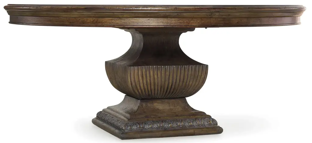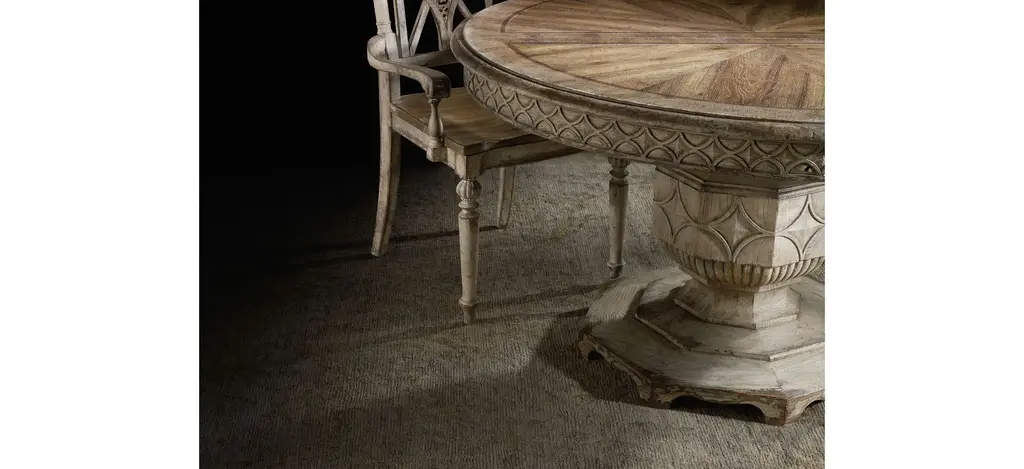 Experience livable luxury every time you gather around the elegant Chatelet Round Dining Table inspired by timeless farm style antiques. The scallop motif fretwork on the apron and center base of the table adds a touch of vintage charm. One 20-inch leaf extends the table to 74 inches, allowing you to seat up to six people.