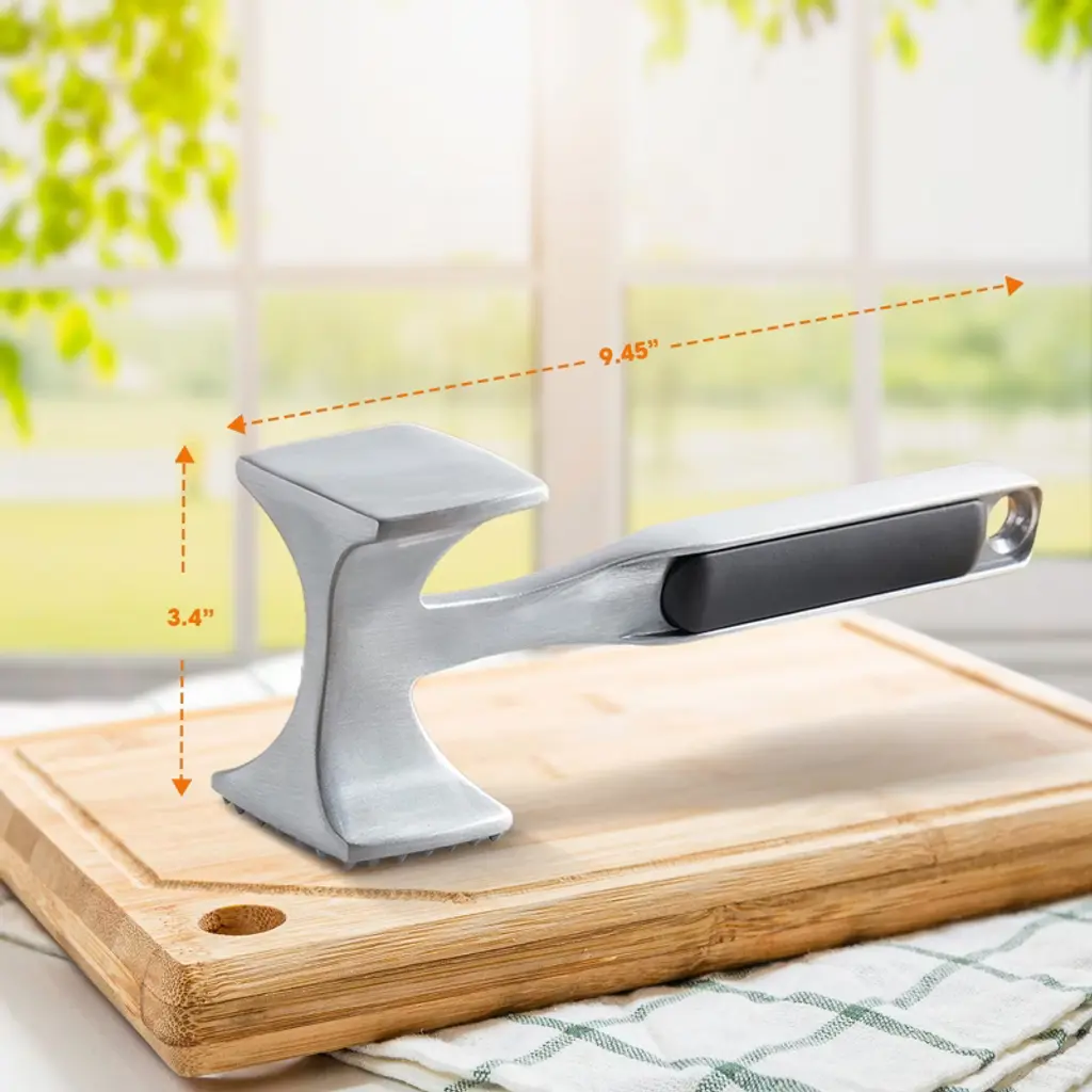 Achieve professional results in your kitchen with the Cheer Collection Dual-Sided Aluminum Meat Tenderizer. Measuring 9.45 inches long by 3.4 inches high and 2 inches wide and weighing just under 0.7 lbs (11 oz), this versatile mallet features a sturdy aluminum body for lightweight handling and excellent durability. Use the textured side to pierce and break tough fibers, tenderizing beef, pork, chicken, or veal while helping marinades soak in for bigger flavor. Flip it over to the smooth side for pounding meat into even, thin cutlets that cook quickly and evenly. Beyond meat, this multi-tasking tool is perfect for crushing garlic, peppercorns, nuts, or hard candies with ease. The ergonomic handle offers a comfortable grip, and the built-in hanging hole keeps storage tidy and accessible. Maintain it easily by hand washing and drying promptly to preserve its pristine finish. Whether you’re preparing gourmet meals or weeknight dinners, this meat tenderizer is your go-to solution for unlocking the perfect texture and taste in every dish