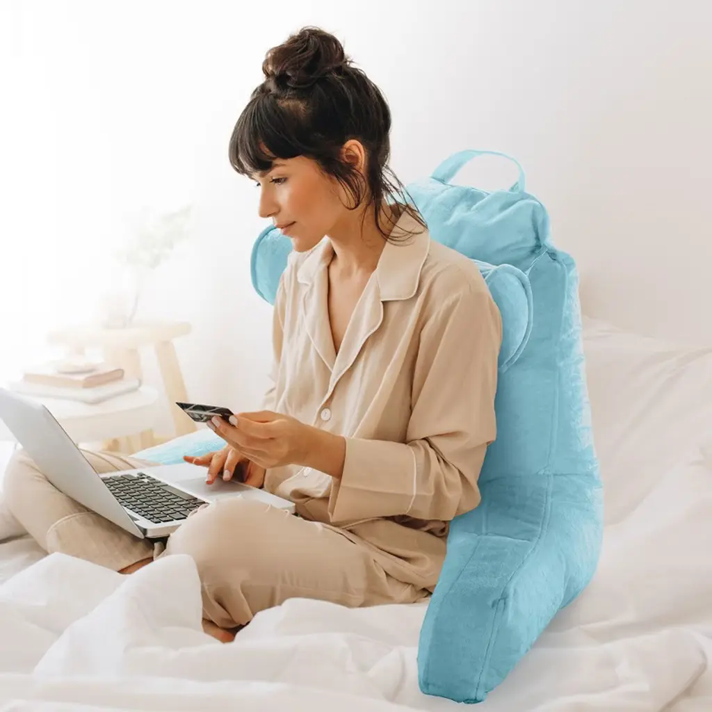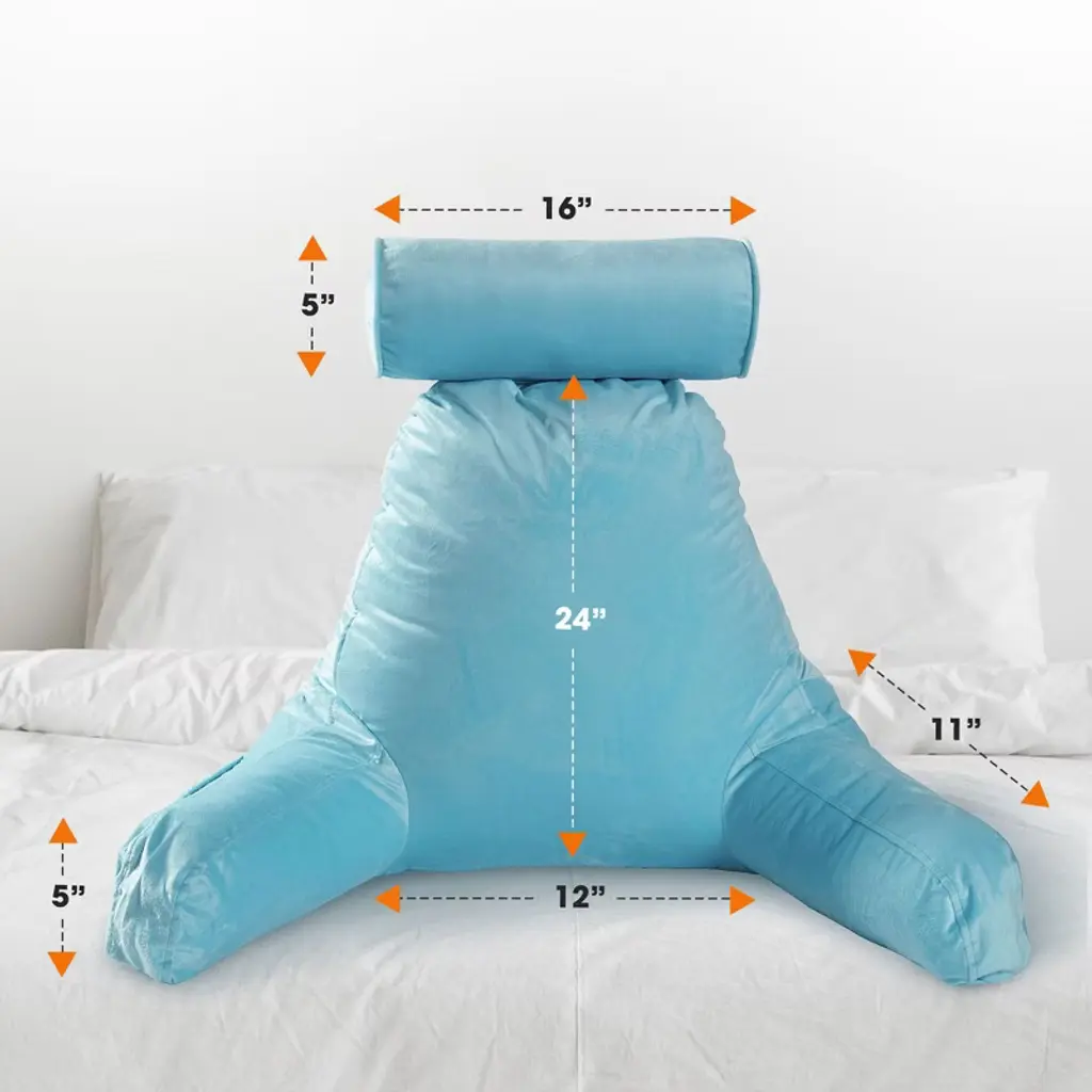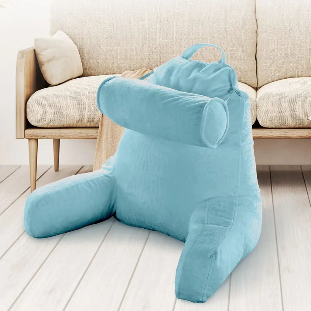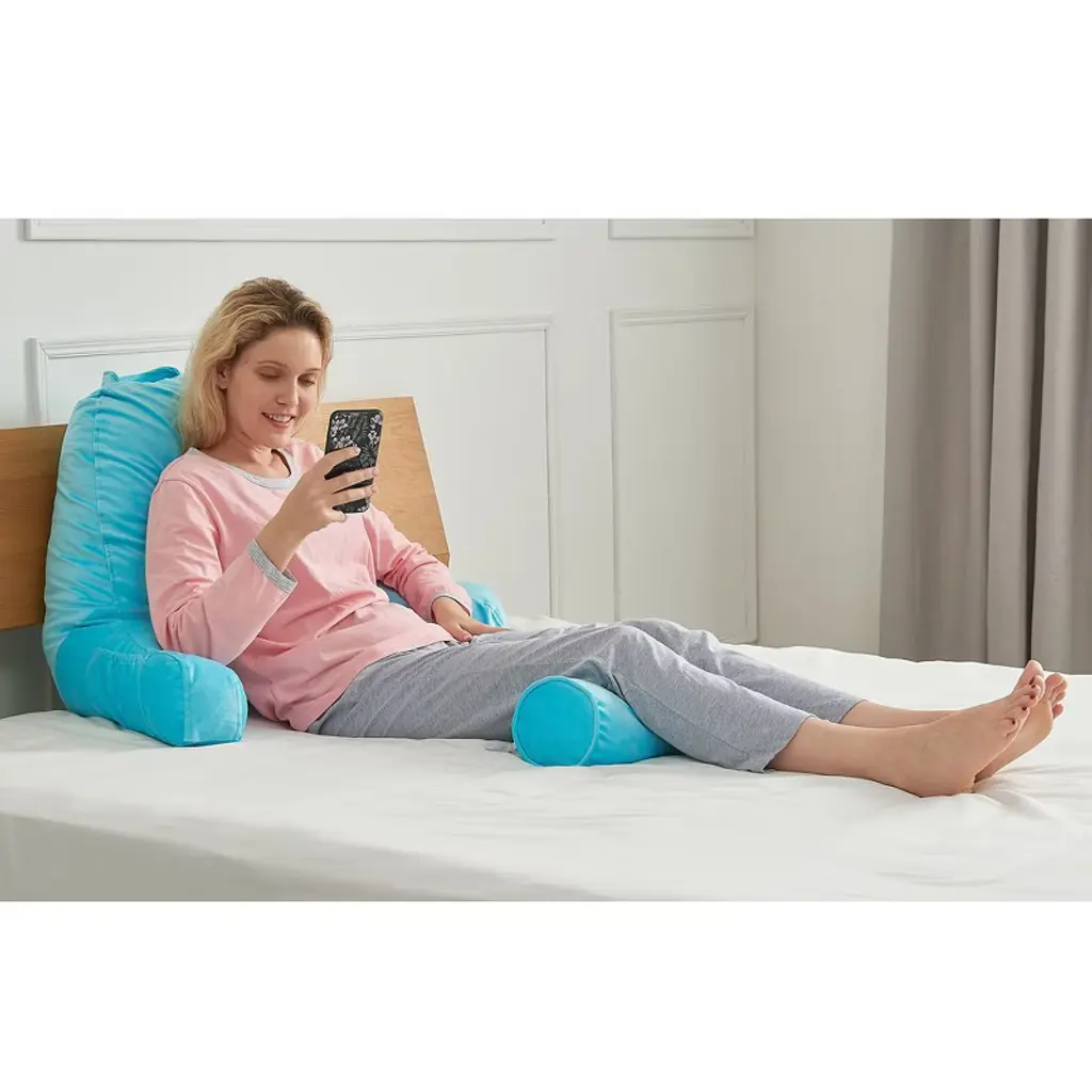 Experience the pinnacle of comfort and convenience with the Cheer Collection TV & Reading Pillow in a sophisticated sky blue color. Designed for those who cherish their leisure time or need extended periods of bed rest, this pillow is a game-changer. Constructed with soft sky blue velour fabric and generously filled with firm hollow fiber, every moment spent reading, gaming, or simply lounging becomes a luxurious affair. The ergonomic design ensures your back, arms, neck, and head receive the proper support they need, with the detachable bolster adding an extra layer of comfort for your neck and head. For those nights when you’re engrossed in a book or binge-watching a series, this pillow ensures your posture remains optimal, reducing undue pressure on your back. The inclusion of a side pocket means your remote or phone is always within arm's reach. Perfect for students, especially in dorm rooms, where extended study sessions are common. The lightweight design, combined with a sturdy top handle, ensures you can take this pillow with you, be it to a friend's dorm or back home during breaks. For those special moments, like pregnancy or recovery post-surgery, the Cheer Collection pillow shines by providing much-needed comfort and support. Maintenance is a breeze with the removable zippered cover that's machine washable. And, as a heads up, your pillow is compressed for shipping. Choose the Cheer Collection Reading Pillow for a relaxation experience like no other. Comfort, convenience, and class all rolled into one.