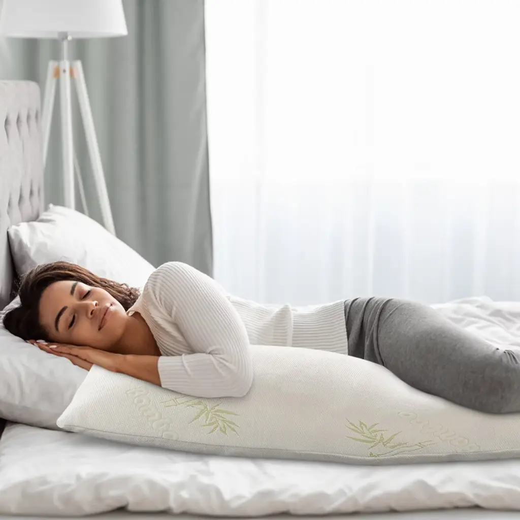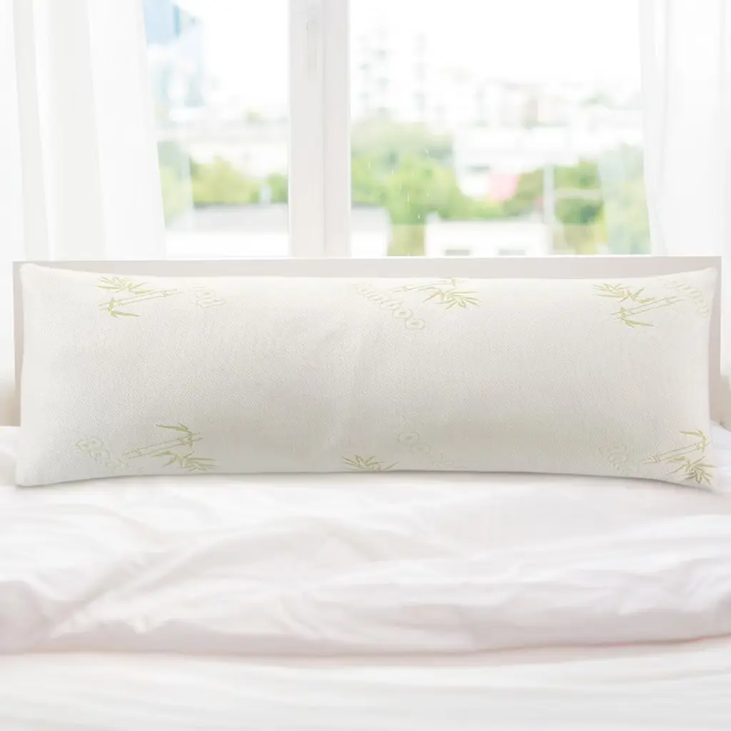 Transform your sleep experience with the Cheer Collection Oversized Shredded Memory Foam Body Pillow, designed to deliver unmatched comfort and support. Measuring an ample 54" x 19", this body pillow perfectly conforms to your body's shape, making it ideal for sleeping, lounging, or relieving discomfort during pregnancy or post-surgery recovery. The pillow features a premium 35D shredded memory foam fill that offers just the right balance of firmness and softness, providing excellent support for your back, hips, and shoulders. Its rayon from bamboo cover enhances breathability, keeping you cool throughout the night while adding a touch of luxury to your bedding. Whether you’re watching TV, reading, nursing, or simply seeking full-body support, this pillow adapts to your needs. Its optimal length minimizes tossing and turning, helping you achieve a deeper, more restorative sleep. The machine-washable cover ensures effortless maintenance, keeping your pillow fresh and clean for years to come. Ideal for side sleepers, expectant mothers, or anyone craving all-night comfort, the Cheer Collection Oversized Shredded Memory Foam Body Pillow is a versatile, must-have addition to your bedroom. Elevate your relaxation and enjoy the perfect blend of support and luxury.