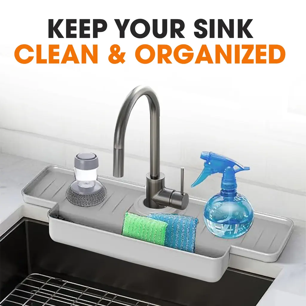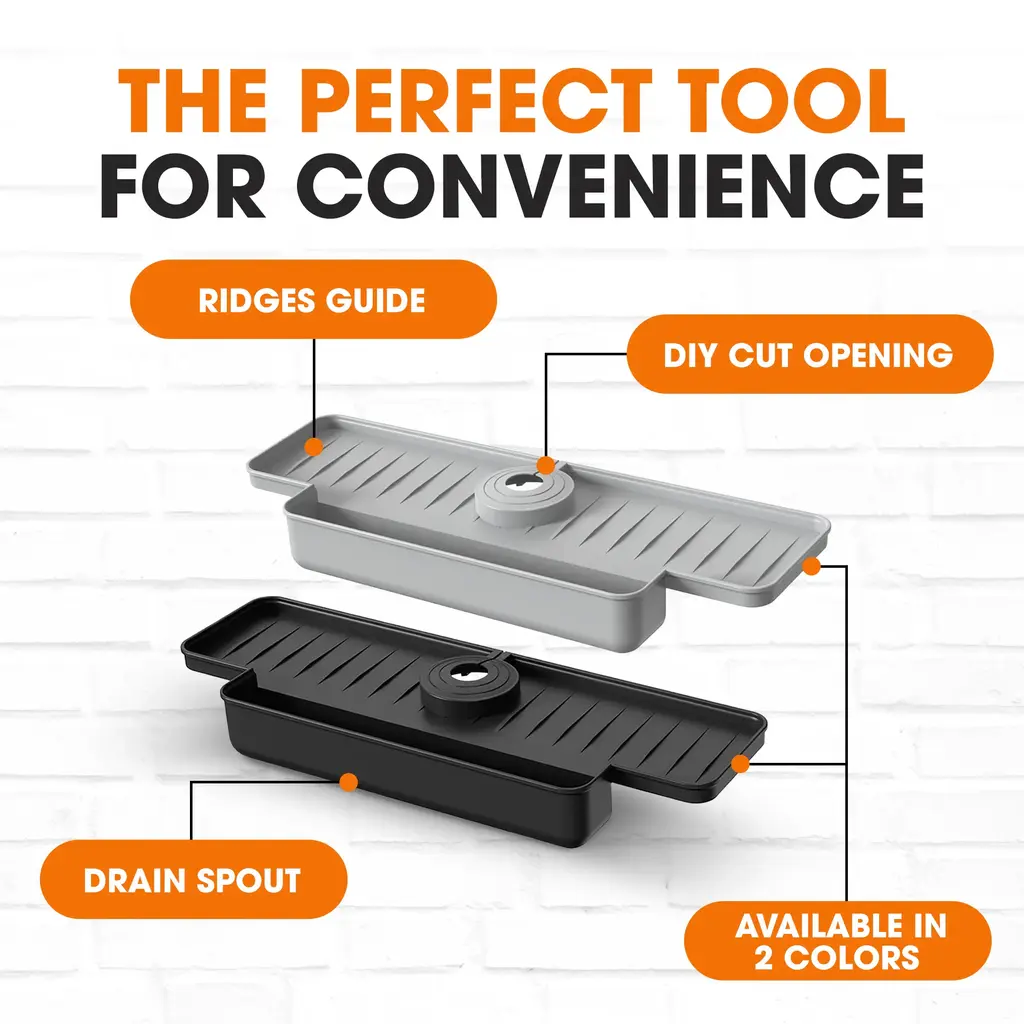Elevate your kitchen's functionality and style with the Cheer Collection Silicone Faucet Draining Mat and Splash Guard. This meticulously designed splash guard features an innovative declining bottom that efficiently directs water into the drain, keeping your countertops dry and free from splatters. Made from high-quality silicone, it ensures durability and a non-slip surface for securely holding items like soap and sponges. Measuring 15.87” x 5.63” x 2.13”, it fits most kitchen sinks, simplifying cleanup and enhancing organization. The quick-dry feature reduces maintenance, making it an essential addition to any modern kitchen.FAST DRAINAGE DESIGN: Innovative declining bottom ensures quicker water drainage, keeping your sink area dry and cleanPREVENTS SPLATTERS: Effectively prevents messy water splatters, maintaining a neat and organized sink spaceDURABLE SILICONE: Made from high-quality, long-lasting silicone that withstands daily useNON-SLIP SURFACE: Anti-slip design securely holds items like soap, sponges, and toothbrushesEASY MAINTENANCE: Quick-dry feature minimizes upkeep, ensuring a clean and hygienic sink areaAmazing Features: