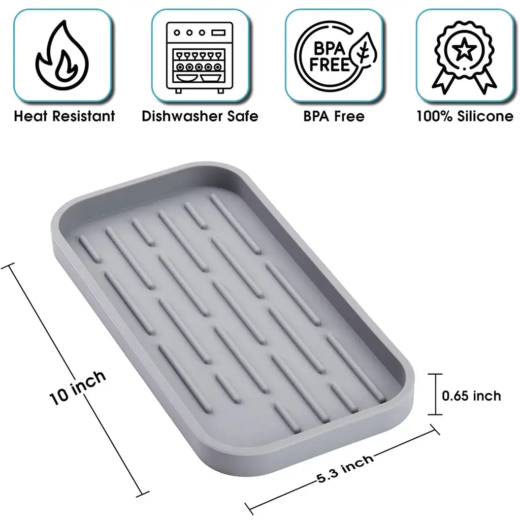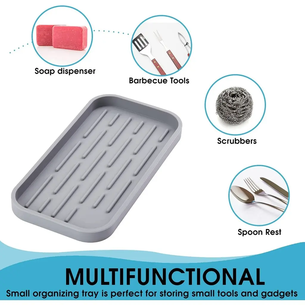 Protect your counters & make your time in The kitchen simpler with the Cheer Collection Silicone Sponge Holder!Whether you’re cleaning up dishes or just organizing your kitchen, our silicone sponge holder has you covered. It’s perfect for preventing sponges and scrubbers from making a wet mess on your counters while keeping them safely in place.The kitchen sink organization tray is waterproof and can handle high heat temperatures without warping, cracking, or deforming. Our kitchen sink tray is made with everyday use in mind to make your day-to-day life just a bit simpler and convenient.Reduce Clutter & Organize Your Space The Simple Way When it comes to quality, we don’t make any exceptions. This multipurpose kitchen counter tray is made using quality silicone that’s heat-resistant, lightweight, and durable to provide long-term use while being easy to clean and maintain. Thanks to the spacious size, our scrubber and soap tray for kitchen sink allows you to store and organize a wide variety of kitchen accessories and supplies ranging from cooking utensils to soap dispensers and more to keep your space neatly organized. - Dishwasher safe to make cleanups quick and convenient - Made without using any BPA, latex, plastics, or harsh materials - Can also be used as a utility, bathroom, laundry, and vanity tray - Simple yet elegant to complement the look of any kitchen - It's designed with a non-slip bottom to stay securely in place