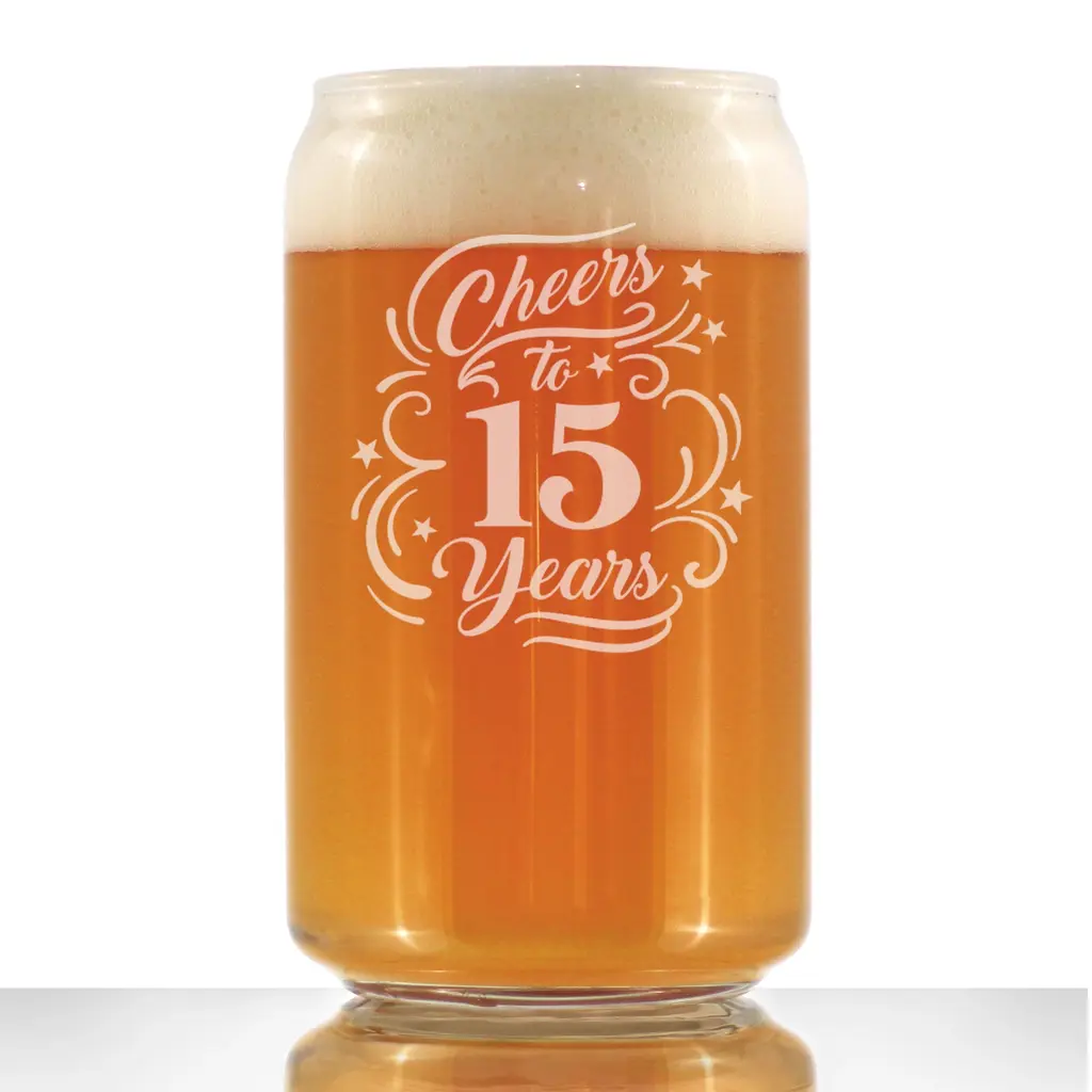 Cheers 15 Years - Beer Can Pint Glass - 15th Anniversary Gifts - 16 Ounce - Clear