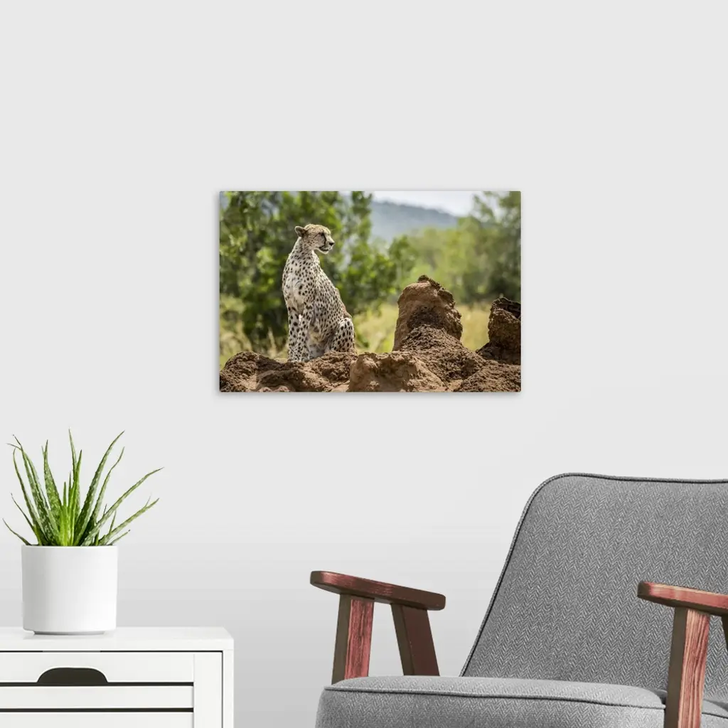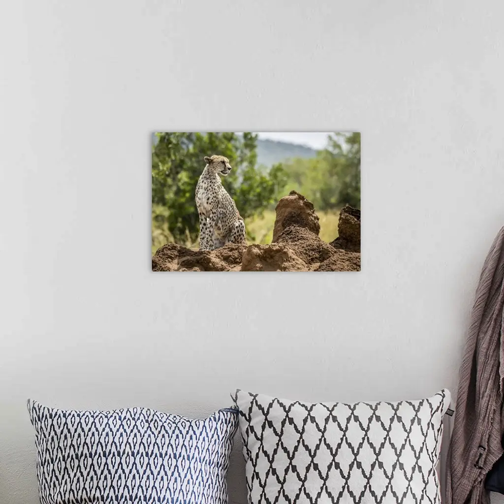 Cheetah (acinonyx jubatu) sitting on termite mound turning head, Serengeti, Tanzania.
