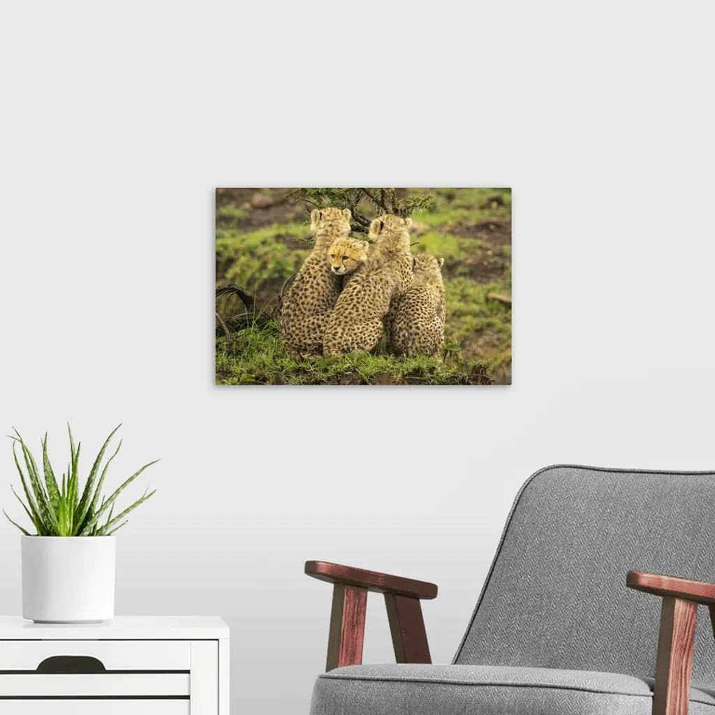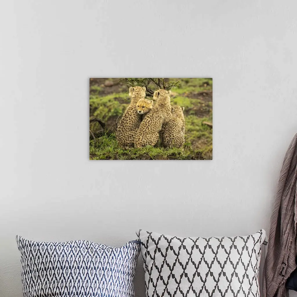 Cheetah cub (Acinonyx jubatus) sits squeezed between three others in Maasai Mara National Reserve; Narok, Masai Mara, Kenya.