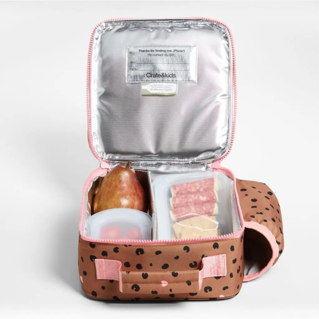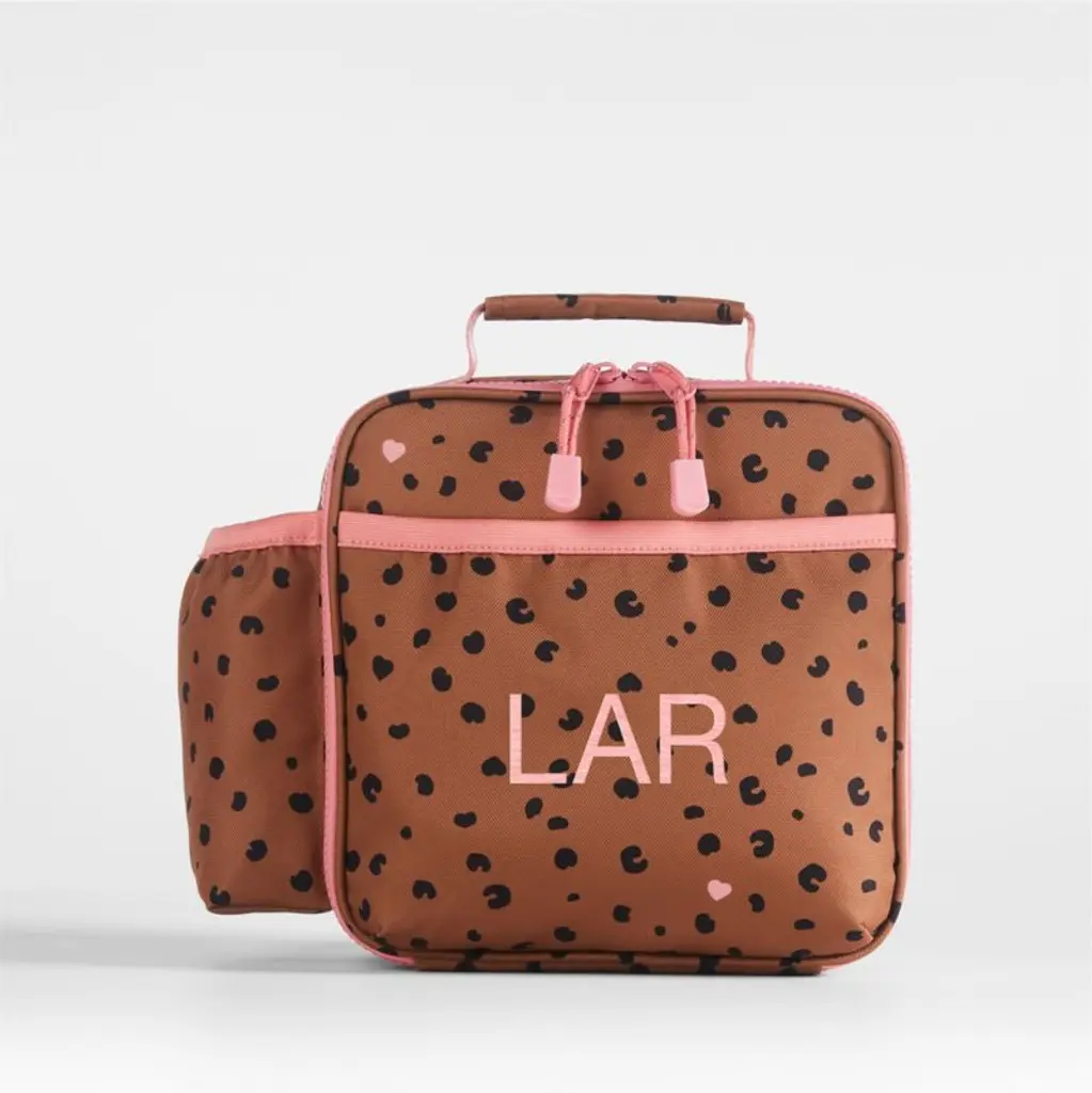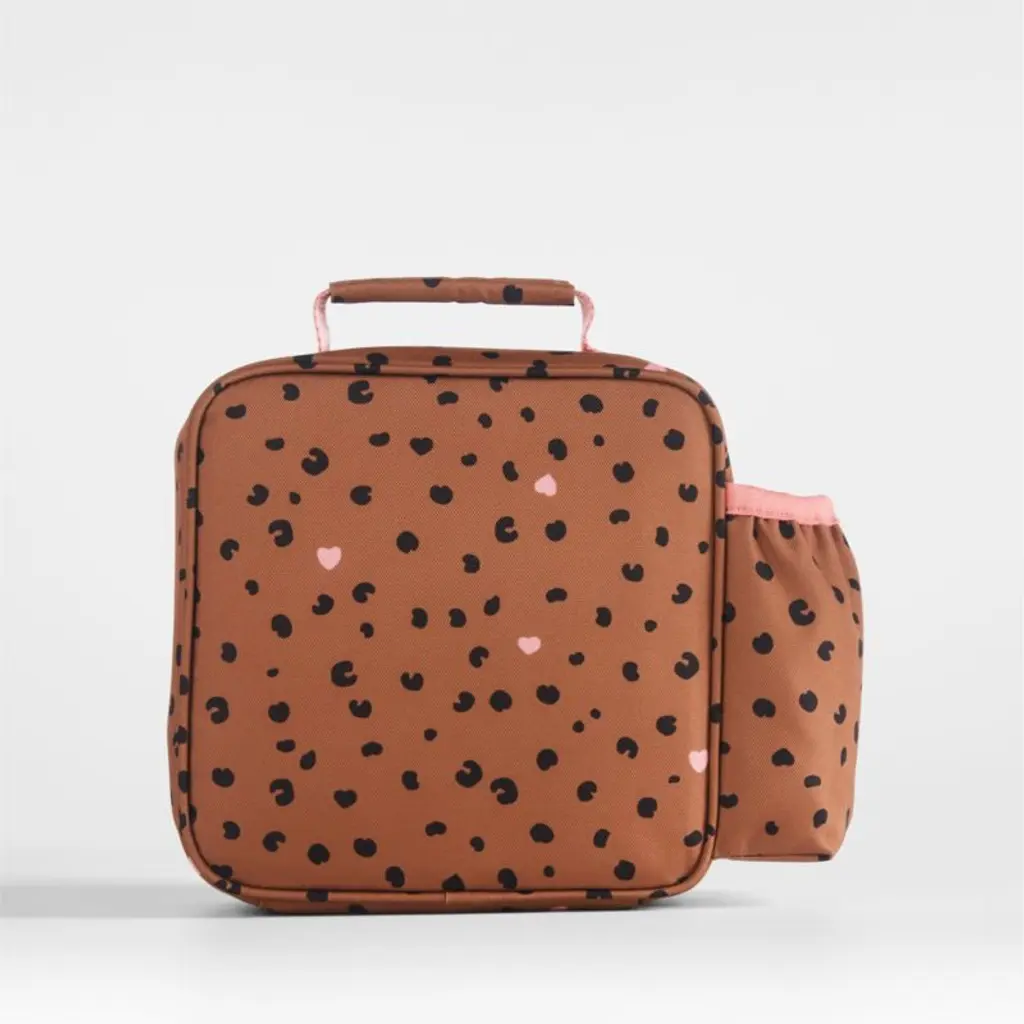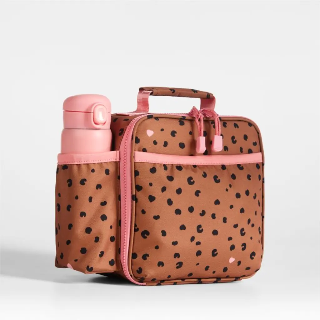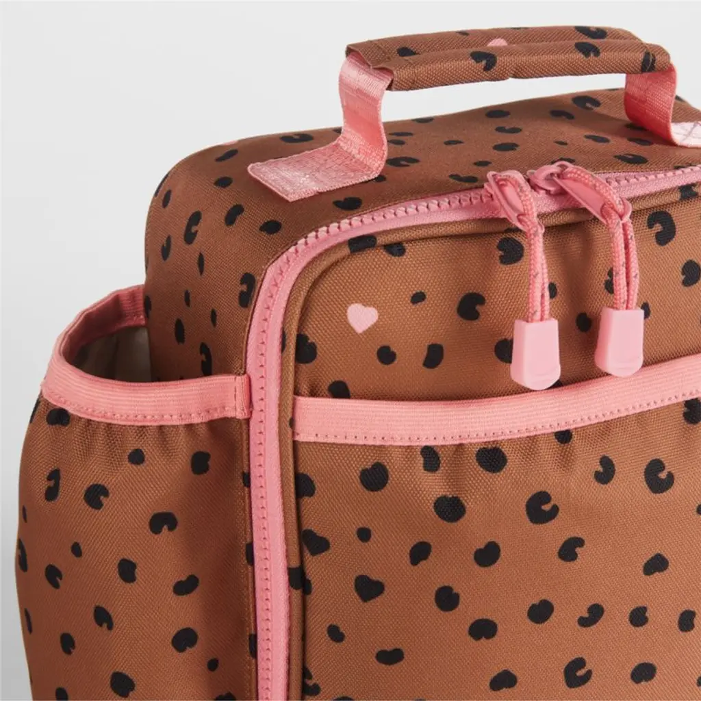 A fun and functional lunch box that's built to handle all the thrills and spills of a day in the wild. Cheetah spots and light pink hearts pattern the bag's tawny brown exterior, and pink trim gives it the perfect finish. Constructed of food-safe and supremely durable polyester made from recycled water bottles, our lightweight, easy-clean lunch box is roomy enough to hold multiple storage containers. Plus, it's insulated to keep meals just the way your kid likes themhot, cold or somewhere in between. An outer pocket safely stows a napkin, utensils, daily reminder notes and more, and a designated water bottle pocket ensures their drink is always close at hand. For spot-on style, pair the lunch box with the matching Cheetah Hearts backpack and water bottle.